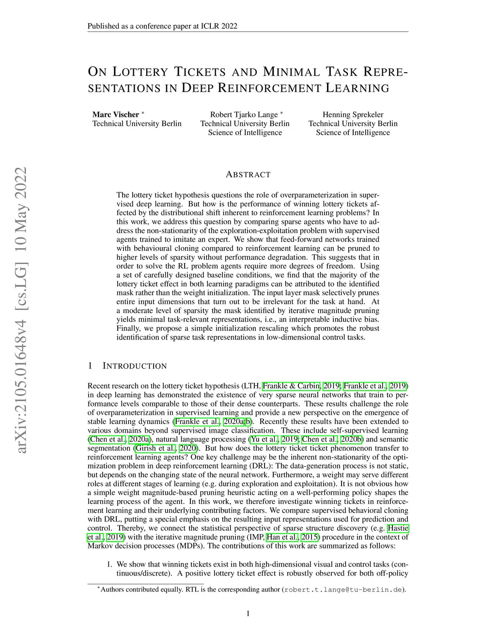 The lottery ticket hypothesis questions the role of overparameterization in supervised deep learning. But how is the performance of winning lottery tickets affected by the distributional shift inherent to reinforcement learning problems? In this work, we address this question by comparing sparse agents who have to address the non-stationarity of the exploration-exploitation problem with supervised agents trained to imitate an expert. We show that feed-forward networks trained with behavioural cloning compared to reinforcement learning can be pruned to higher levels of sparsity without performance degradation. This suggests that in order to solve the RL-specific distributional shift agents require more degrees of freedom. Using a set of carefully designed baseline conditions, we find that the majority of the lottery ticket effect in both learning paradigms can be attributed to the identified mask rather than the weight initialization. The input layer mask selectively prunes entire input dimensions that turn out to be irrelevant for the task at hand. At a moderate level of sparsity the mask identified by iterative magnitude pruning yields minimal task-relevant representations, i.e., an interpretable inductive bias. Finally, we propose a simple initialization rescaling which promotes the robust identification of sparse task representations in low-dimensional control tasks.