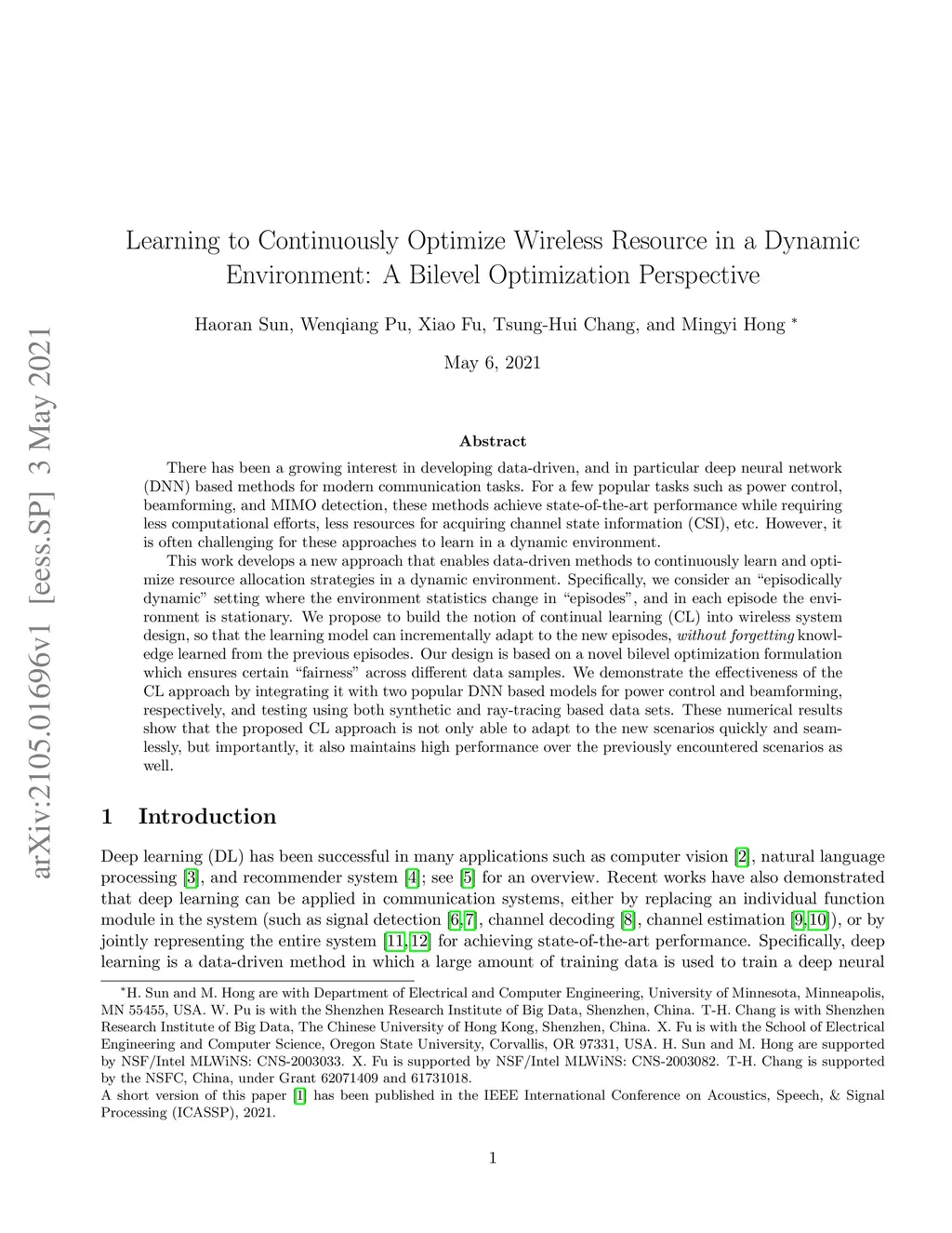 There has been a growing interest in developing data-driven, and in particular deep neural network (DNN) based methods for modern communication tasks. For a few popular tasks such as power control, beamforming, and MIMO detection, these methods achieve state-of-the-art performance while requiring less computational efforts, less resources for acquiring channel state information (CSI), etc. However, it is often challenging for these approaches to learn in a dynamic environment. This work develops a new approach that enables data-driven methods to continuously learn and optimize resource allocation strategies in a dynamic environment. Specifically, we consider an ``episodically dynamic" setting where the environment statistics change in ``episodes", and in each episode the environment is stationary. We propose to build the notion of continual learning (CL) into wireless system design, so that the learning model can incrementally adapt to the new episodes, {\it without forgetting} knowledge learned from the previous episodes. Our design is based on a novel bilevel optimization formulation which ensures certain ``fairness" across different data samples. We demonstrate the effectiveness of the CL approach by integrating it with two popular DNN based models for power control and beamforming, respectively, and testing using both synthetic and ray-tracing based data sets. These numerical results show that the proposed CL approach is not only able to adapt to the new scenarios quickly and seamlessly, but importantly, it also maintains high performance over the previously encountered scenarios as well.