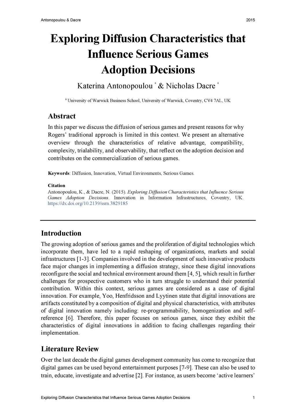 In this paper we discuss the diffusion of serious games and present reasons for why Rogers traditional approach is limited in this context. We present an alternative overview through the characteristics of relative advantage, compatibility, complexity, trialability, and observability, that reflect on the adoption decision and contributes on the commercialization of serious games.