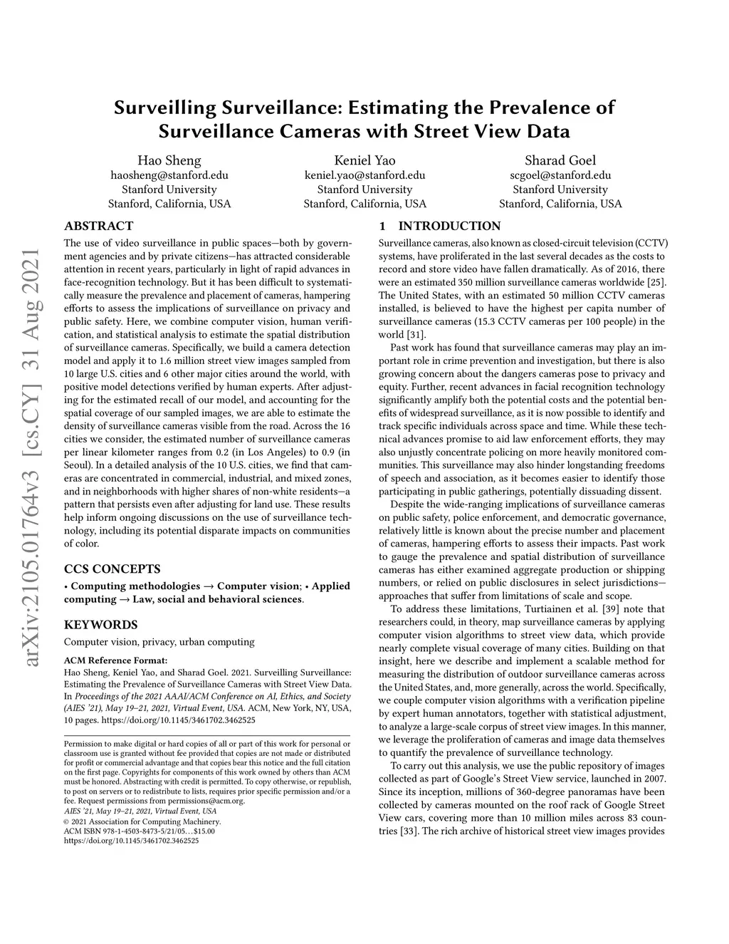 The use of video surveillance in public spaces -- both by government agencies and by private citizens -- has attracted considerable attention in recent years, particularly in light of rapid advances in face-recognition technology. But it has been difficult to systematically measure the prevalence and placement of cameras, hampering efforts to assess the implications of surveillance on privacy and public safety. Here, we combine computer vision, human verification, and statistical analysis to estimate the spatial distribution of surveillance cameras. Specifically, we build a camera detection model and apply it to 1.6 million street view images sampled from 10 large U.S. cities and 6 other major cities around the world, with positive model detections verified by human experts. After adjusting for the estimated recall of our model, and accounting for the spatial coverage of our sampled images, we are able to estimate the density of surveillance cameras visible from the road. Across the 16 cities we consider, the estimated number of surveillance cameras per linear kilometer ranges from 0.2 (in Los Angeles) to 0.9 (in Seoul). In a detailed analysis of the 10 U.S. cities, we find that cameras are concentrated in commercial, industrial, and mixed zones, and in neighborhoods with higher shares of non-white residents -- a pattern that persists even after adjusting for land use. These results help inform ongoing discussions on the use of surveillance technology, including its potential disparate impacts on communities of color.