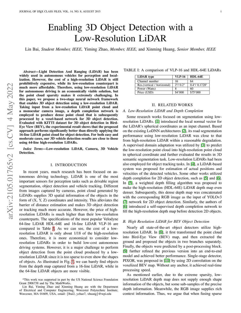 Light Detection And Ranging (LiDAR) has been widely used in autonomous vehicles for perception and localization. However, the cost of a high-resolution LiDAR is still prohibitively expensive, while its low-resolution counterpart is much more affordable. Therefore, using low-resolution LiDAR for autonomous driving is an economically viable solution, but the point cloud sparsity makes it extremely challenging. In this paper, we propose a two-stage neural network framework that enables 3D object detection using a low-resolution LiDAR. Taking input from a low-resolution LiDAR point cloud and a monocular camera image, a depth completion network is employed to produce dense point cloud that is subsequently processed by a voxel-based network for 3D object detection. Evaluated with KITTI dataset for 3D object detection in Bird-Eye View (BEV), the experimental result shows that the proposed approach performs significantly better than directly applying the 16-line LiDAR point cloud for object detection. For both easy and moderate cases, our 3D vehicle detection results are close to those using 64-line high-resolution LiDARs.