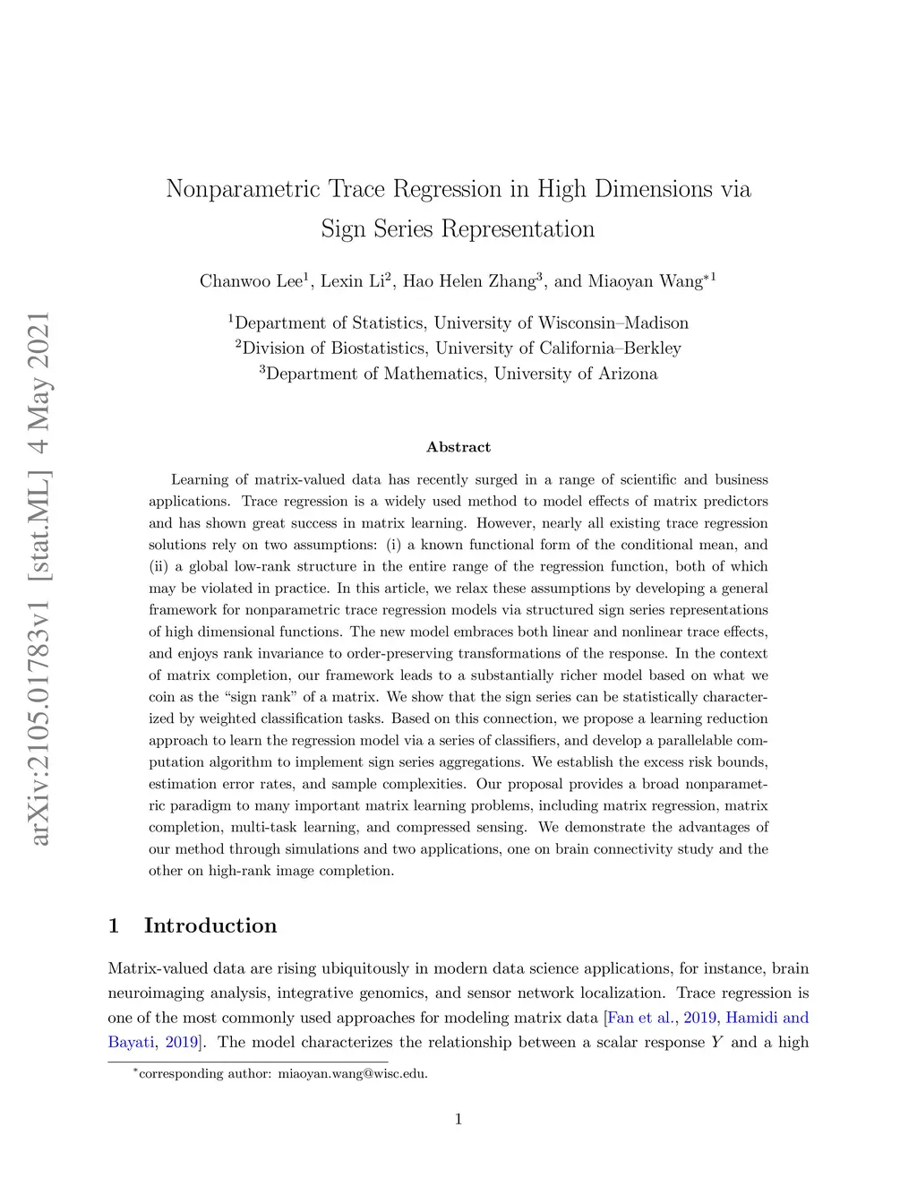 Learning of matrix-valued data has recently surged in a range of scientific and business applications. Trace regression is a widely used method to model effects of matrix predictors and has shown great success in matrix learning. However, nearly all existing trace regression solutions rely on two assumptions: (i) a known functional form of the conditional mean, and (ii) a global low-rank structure in the entire range of the regression function, both of which may be violated in practice. In this article, we relax these assumptions by developing a general framework for nonparametric trace regression models via structured sign series representations of high dimensional functions. The new model embraces both linear and nonlinear trace effects, and enjoys rank invariance to order-preserving transformations of the response. In the context of matrix completion, our framework leads to a substantially richer model based on what we coin as the "sign rank" of a matrix. We show that the sign series can be statistically characterized by weighted classification tasks. Based on this connection, we propose a learning reduction approach to learn the regression model via a series of classifiers, and develop a parallelable computation algorithm to implement sign series aggregations. We establish the excess risk bounds, estimation error rates, and sample complexities. Our proposal provides a broad nonparametric paradigm to many important matrix learning problems, including matrix regression, matrix completion, multi-task learning, and compressed sensing. We demonstrate the advantages of our method through simulations and two applications, one on brain connectivity study and the other on high-rank image completion.