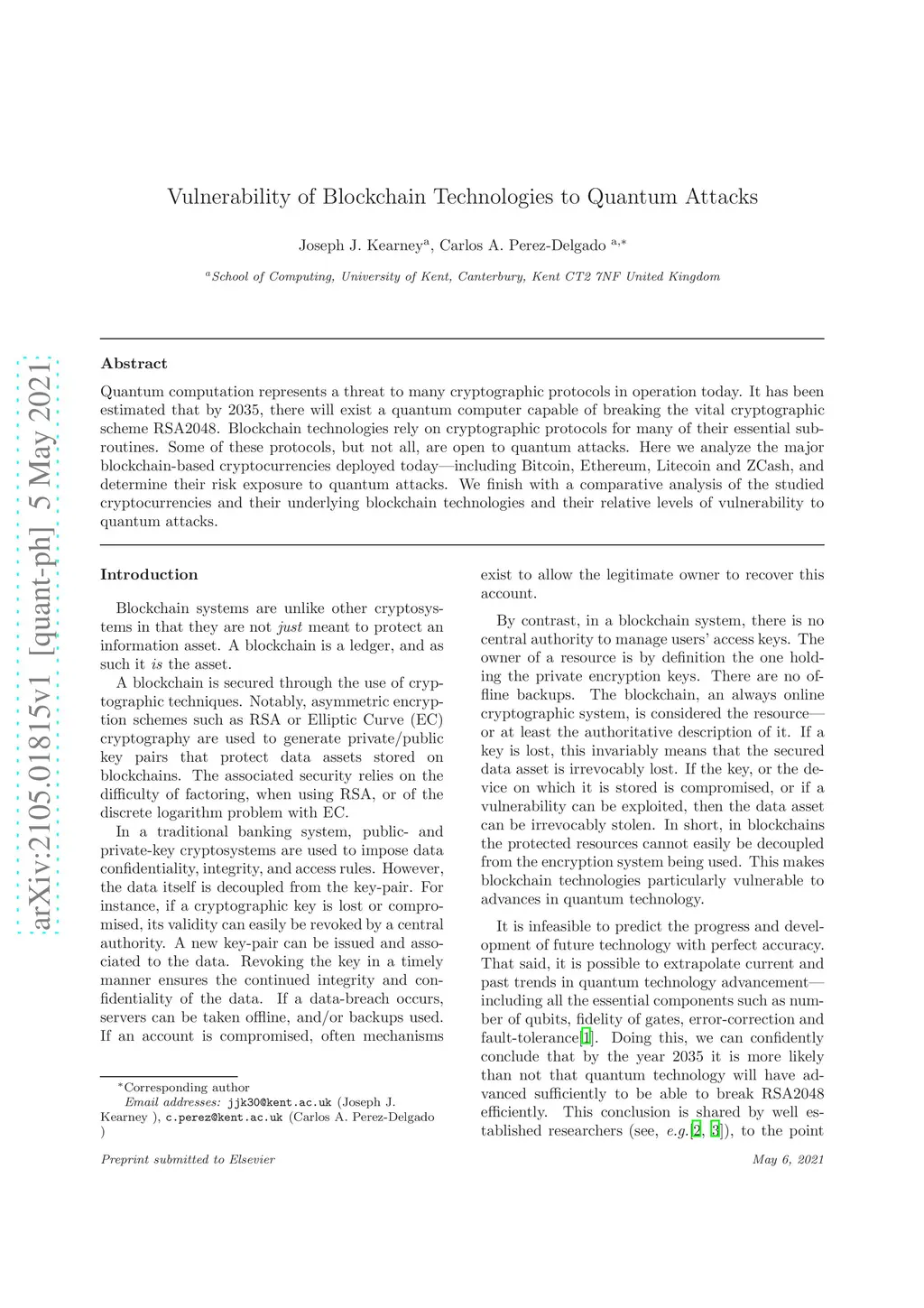 Vulnerability of Blockchain Technologies to Quantum Attacks