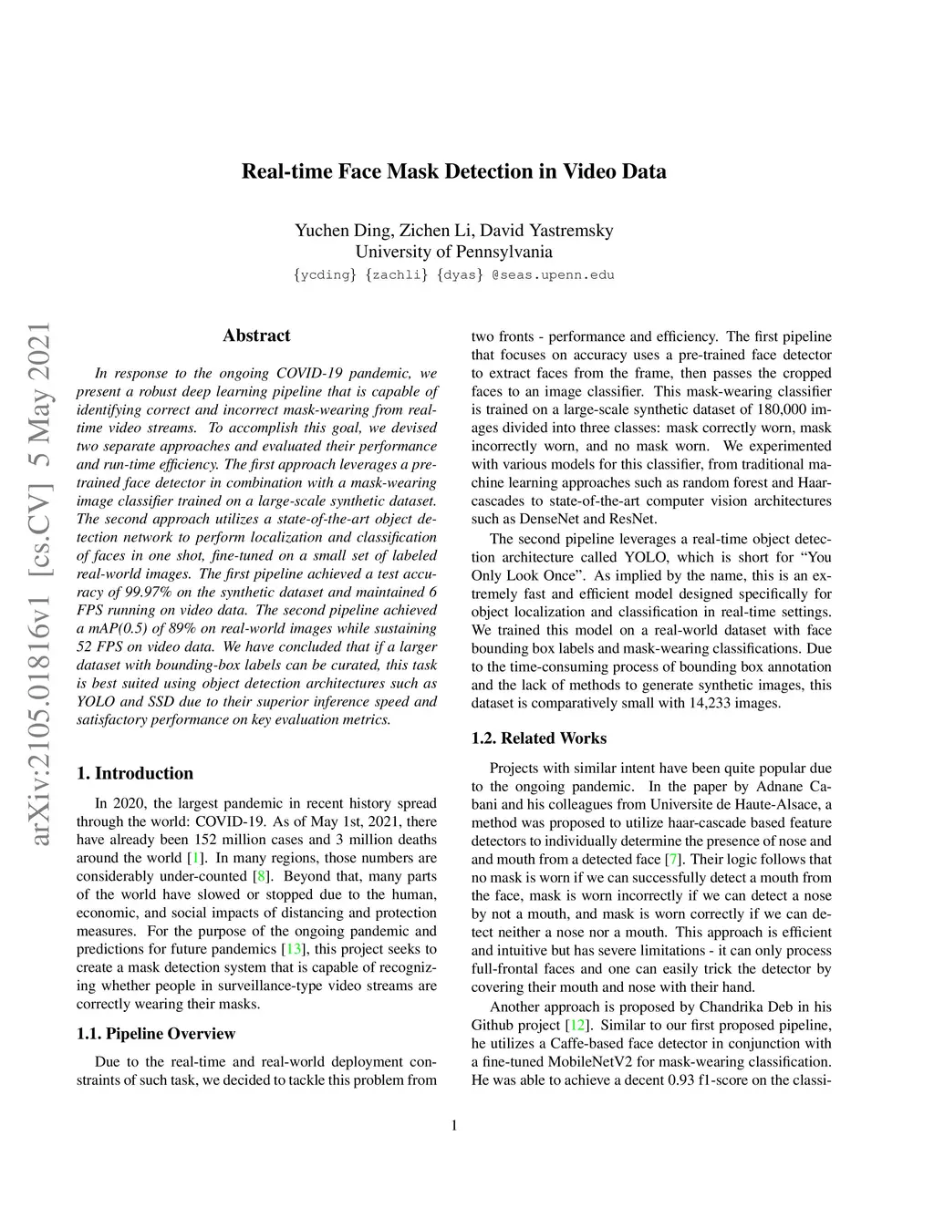 In response to the ongoing COVID-19 pandemic, we present a robust deep learning pipeline that is capable of identifying correct and incorrect mask-wearing from real-time video streams. To accomplish this goal, we devised two separate approaches and evaluated their performance and run-time efficiency. The first approach leverages a pre-trained face detector in combination with a mask-wearing image classifier trained on a large-scale synthetic dataset. The second approach utilizes a state-of-the-art object detection network to perform localization and classification of faces in one shot, fine-tuned on a small set of labeled real-world images. The first pipeline achieved a test accuracy of 99.97% on the synthetic dataset and maintained 6 FPS running on video data. The second pipeline achieved a mAP(0.5) of 89% on real-world images while sustaining 52 FPS on video data. We have concluded that if a larger dataset with bounding-box labels can be curated, this task is best suited using object detection architectures such as YOLO and SSD due to their superior inference speed and satisfactory performance on key evaluation metrics.