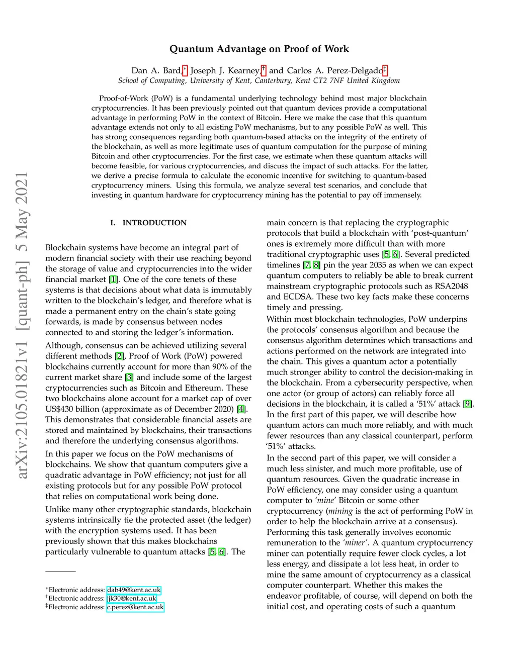 Proof-of-Work (PoW) is a fundamental underlying technology behind most major blockchain cryptocurrencies. It has been previously pointed out that quantum devices provide a computational advantage in performing PoW in the context of Bitcoin. Here we make the case that this quantum advantage extends not only to all existing PoW mechanisms, but to any possible PoW as well. This has strong consequences regarding both quantum-based attacks on the integrity of the entirety of the blockchain, as well as more legitimate uses of quantum computation for the purpose of mining Bitcoin and other cryptocurrencies. For the first case, we estimate when these quantum attacks will become feasible, for various cryptocurrencies, and discuss the impact of such attacks. For the latter, we derive a precise formula to calculate the economic incentive for switching to quantum-based cryptocurrency miners. Using this formula, we analyze several test scenarios, and conclude that investing in quantum hardware for cryptocurrency mining has the potential to pay off immensely.