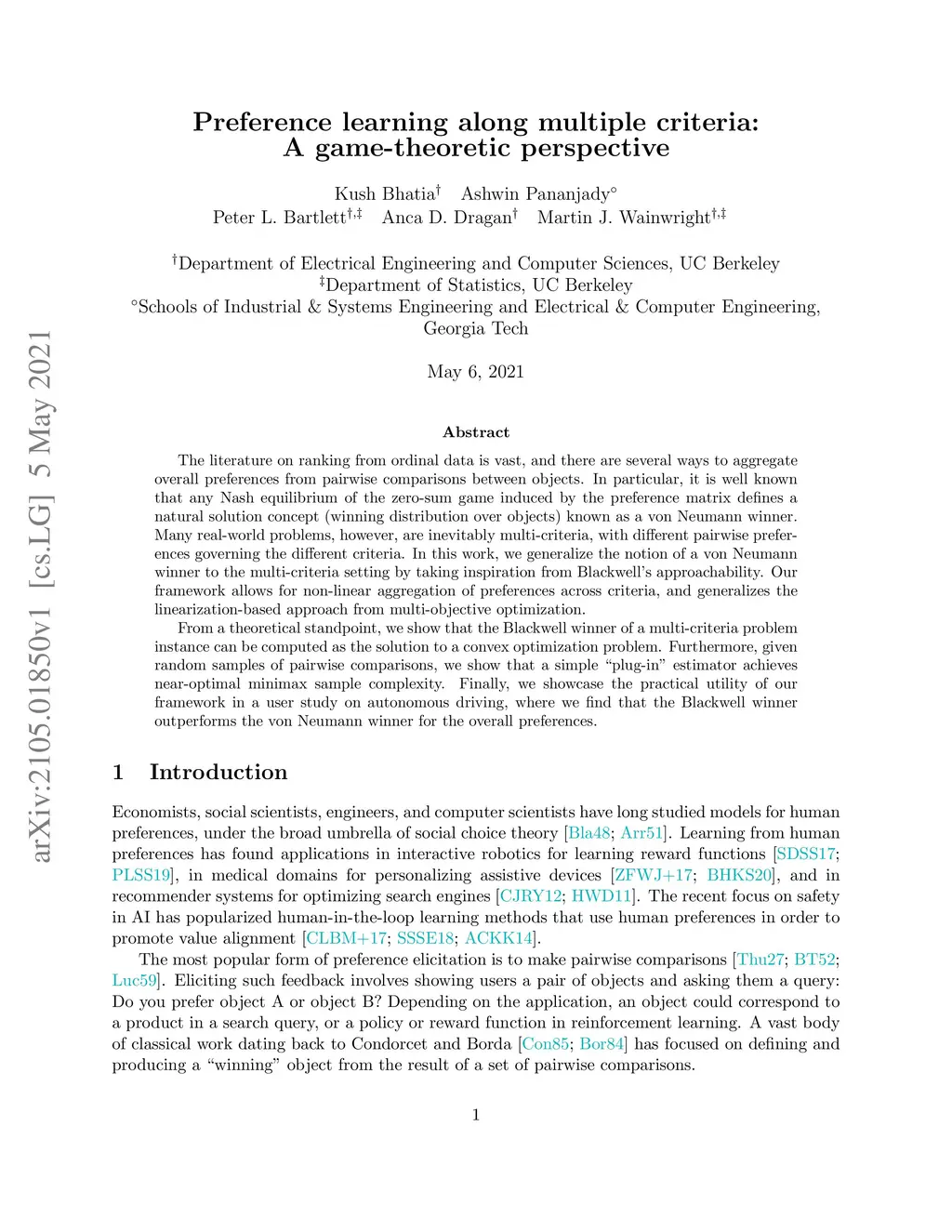Preference learning along multiple criteria: A game-theoretic