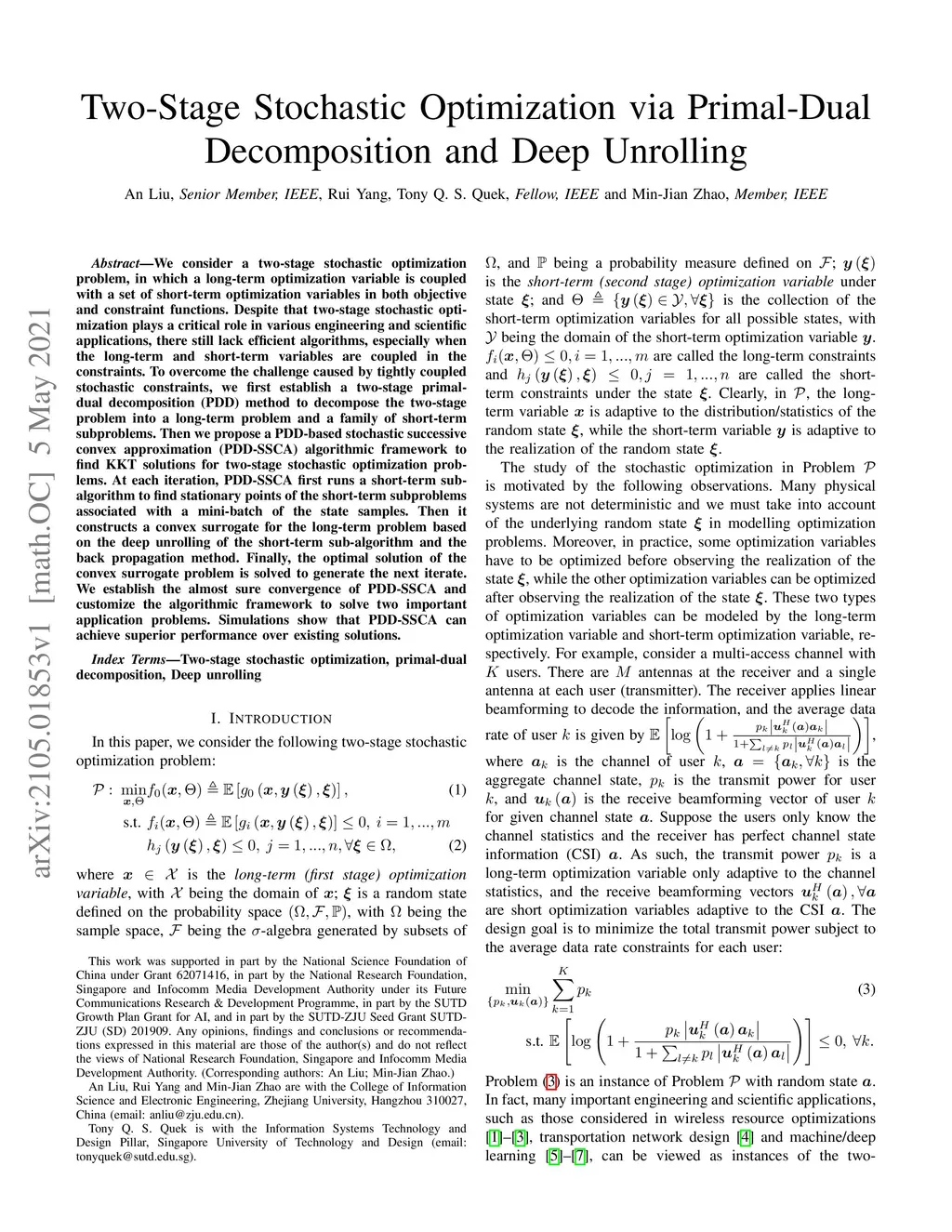 We consider a two-stage stochastic optimization problem, in which a long-term optimization variable is coupled with a set of short-term optimization variables in both objective and constraint functions. Despite that two-stage stochastic optimization plays a critical role in various engineering and scientific applications, there still lack efficient algorithms, especially when the long-term and short-term variables are coupled in the constraints. To overcome the challenge caused by tightly coupled stochastic constraints, we first establish a two-stage primal-dual decomposition (PDD) method to decompose the two-stage problem into a long-term problem and a family of short-term subproblems. Then we propose a PDD-based stochastic successive convex approximation (PDD-SSCA) algorithmic framework to find KKT solutions for two-stage stochastic optimization problems. At each iteration, PDD-SSCA first runs a short-term sub-algorithm to find stationary points of the short-term subproblems associated with a mini-batch of the state samples. Then it constructs a convex surrogate for the long-term problem based on the deep unrolling of the short-term sub-algorithm and the back propagation method. Finally, the optimal solution of the convex surrogate problem is solved to generate the next iterate. We establish the almost sure convergence of PDD-SSCA and customize the algorithmic framework to solve two important application problems. Simulations show that PDD-SSCA can achieve superior performance over existing solutions.