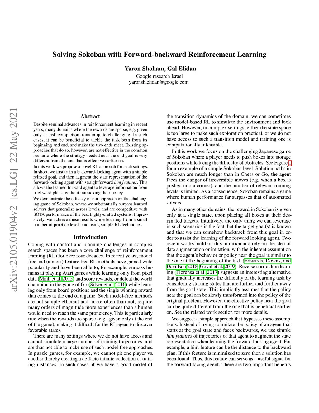 Despite seminal advances in reinforcement learning in recent years, many domains where the rewards are sparse, e.g. given only at task completion, remain quite challenging. In such cases, it can be beneficial to tackle the task both from its beginning and end, and make the two ends meet. Existing approaches that do so, however, are not effective in the common scenario where the strategy needed near the end goal is very different from the one that is effective earlier on. In this work we propose a novel RL approach for such settings. In short, we first train a backward-looking agent with a simple relaxed goal, and then augment the state representation of the forward-looking agent with straightforward hint features. This allows the learned forward agent to leverage information from backward plans, without mimicking their policy. We demonstrate the efficacy of our approach on the challenging game of Sokoban, where we substantially surpass learned solvers that generalize across levels, and are competitive with SOTA performance of the best highly-crafted systems. Impressively, we achieve these results while learning from a small number of practice levels and using simple RL techniques.