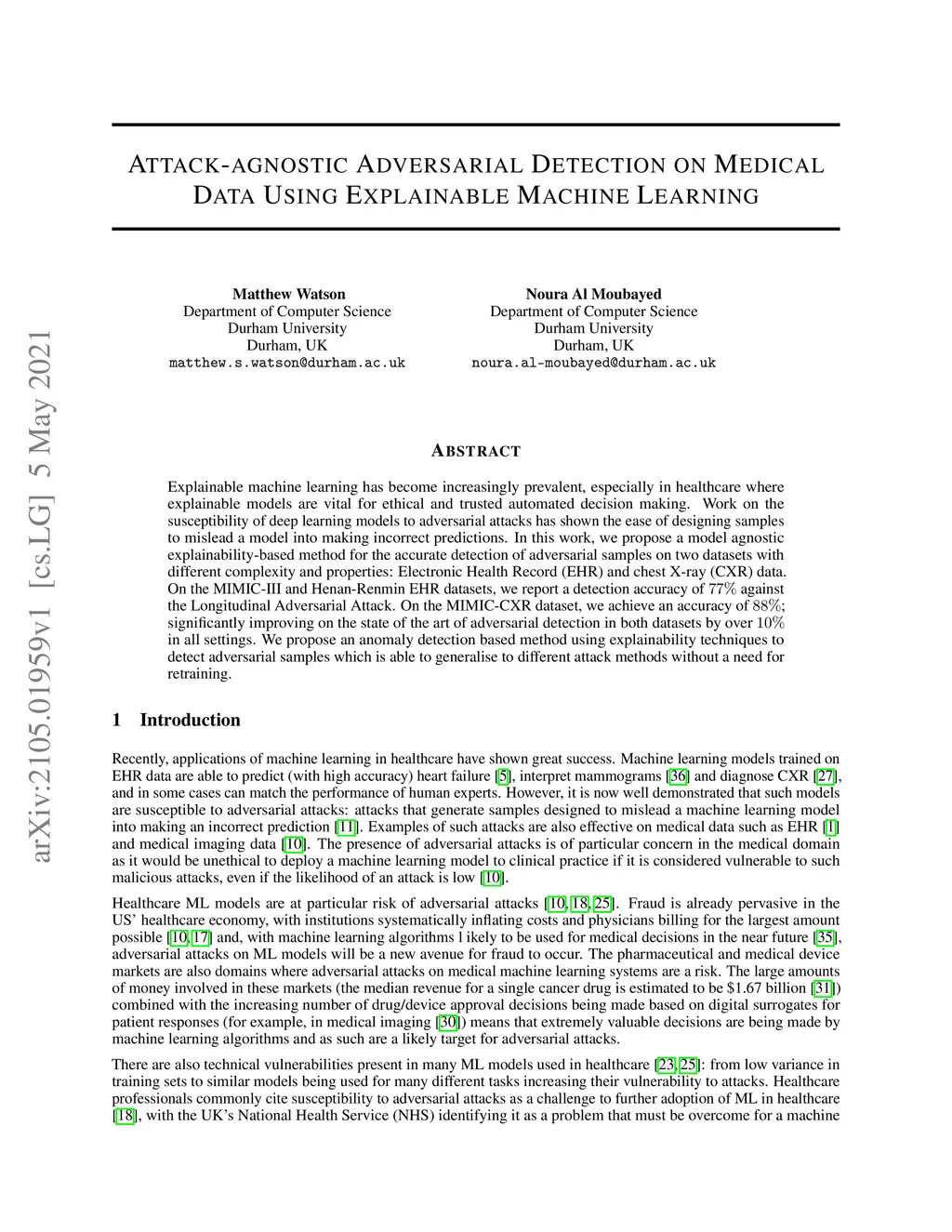 Explainable machine learning has become increasingly prevalent, especially in healthcare where explainable models are vital for ethical and trusted automated decision making. Work on the susceptibility of deep learning models to adversarial attacks has shown the ease of designing samples to mislead a model into making incorrect predictions. In this work, we propose a model agnostic explainability-based method for the accurate detection of adversarial samples on two datasets with different complexity and properties: Electronic Health Record (EHR) and chest X-ray (CXR) data. On the MIMIC-III and Henan-Renmin EHR datasets, we report a detection accuracy of 77% against the Longitudinal Adversarial Attack. On the MIMIC-CXR dataset, we achieve an accuracy of 88%; significantly improving on the state of the art of adversarial detection in both datasets by over 10% in all settings. We propose an anomaly detection based method using explainability techniques to detect adversarial samples which is able to generalise to different attack methods without a need for retraining.