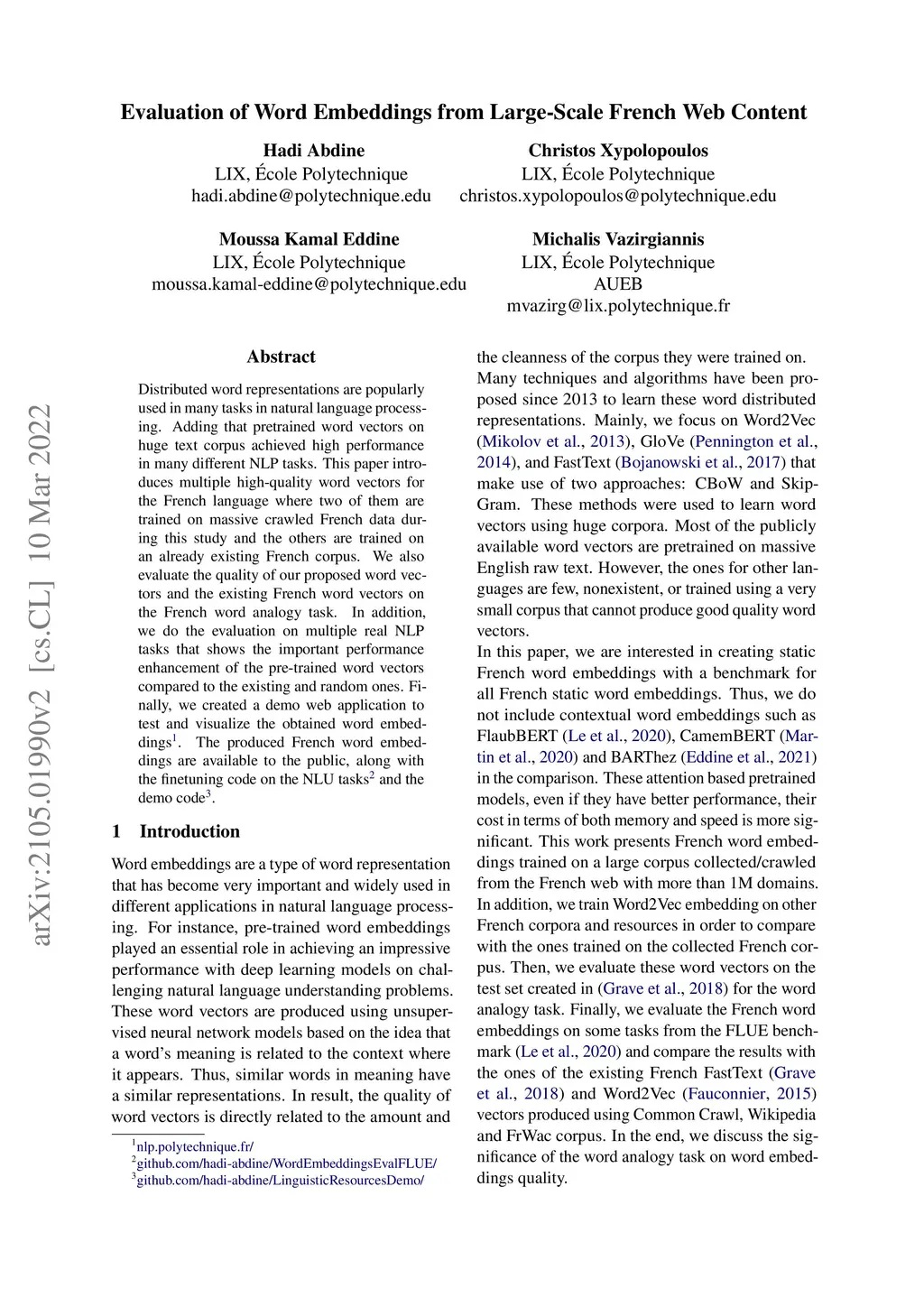 Distributed word representations are popularly used in many tasks in natural language processing. Adding that pretrained word vectors on huge text corpus achieved high performance in many different NLP tasks. This paper introduces multiple high-quality word vectors for the French language where two of them are trained on massive crawled French data during this study and the others are trained on an already existing French corpus. We also evaluate the quality of our proposed word vectors and the existing French word vectors on the French word analogy task. In addition, we do the evaluation on multiple real NLP tasks that shows the important performance enhancement of the pre-trained word vectors compared to the existing and random ones. Finally, we created a demo web application to test and visualize the obtained word embeddings. The produced French word embeddings are available to the public, along with the finetuning code on the NLU tasks and the demo code.