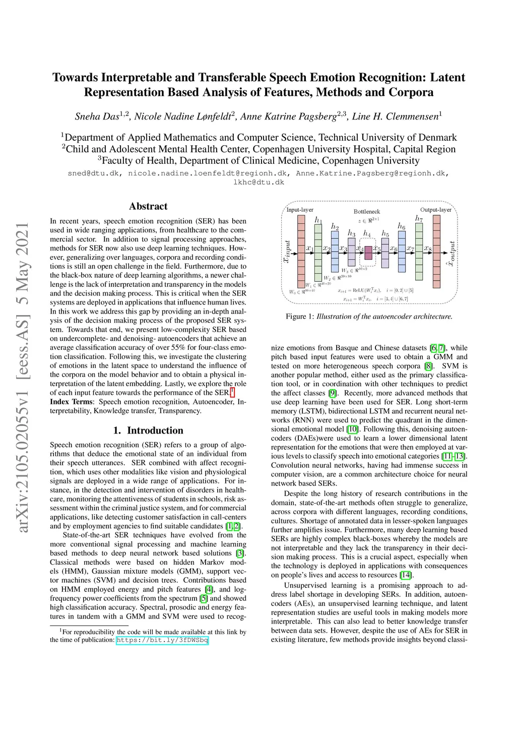 In recent years, speech emotion recognition (SER) has been used in wide ranging applications, from healthcare to the commercial sector. In addition to signal processing approaches, methods for SER now also use deep learning techniques. However, generalizing over languages, corpora and recording conditions is still an open challenge in the field. Furthermore, due to the black-box nature of deep learning algorithms, a newer challenge is the lack of interpretation and transparency in the models and the decision making process. This is critical when the SER systems are deployed in applications that influence human lives. In this work we address this gap by providing an in-depth analysis of the decision making process of the proposed SER system. Towards that end, we present low-complexity SER based on undercomplete- and denoising- autoencoders that achieve an average classification accuracy of over 55\% for four-class emotion classification. Following this, we investigate the clustering of emotions in the latent space to understand the influence of the corpora on the model behavior and to obtain a physical interpretation of the latent embedding. Lastly, we explore the role of each input feature towards the performance of the SER.