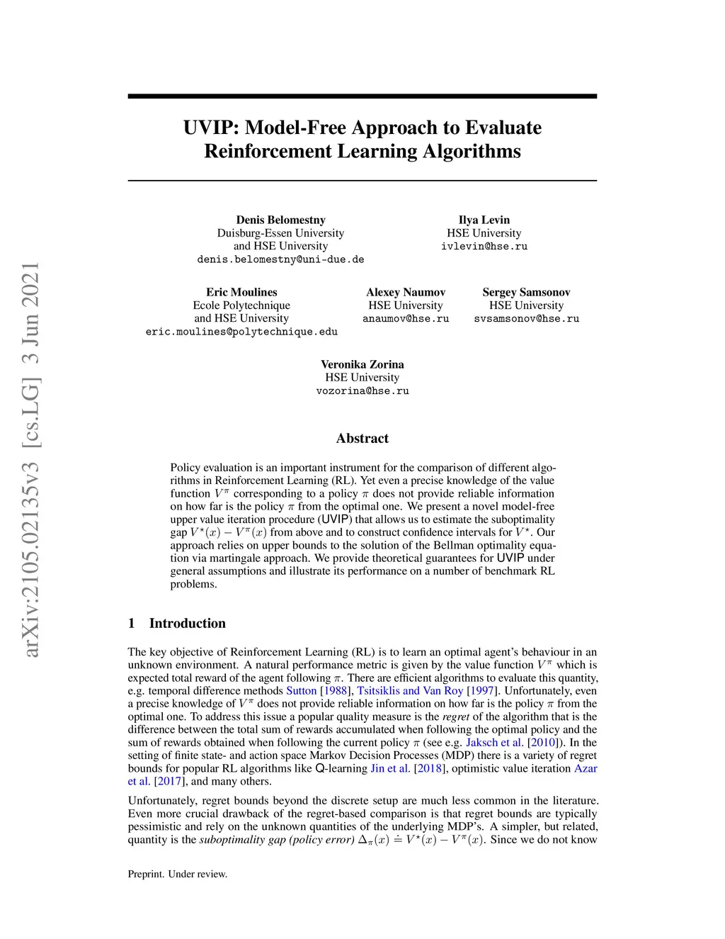 UVIP: Model-Free Approach to Evaluate Reinforcement Learning Algorithms