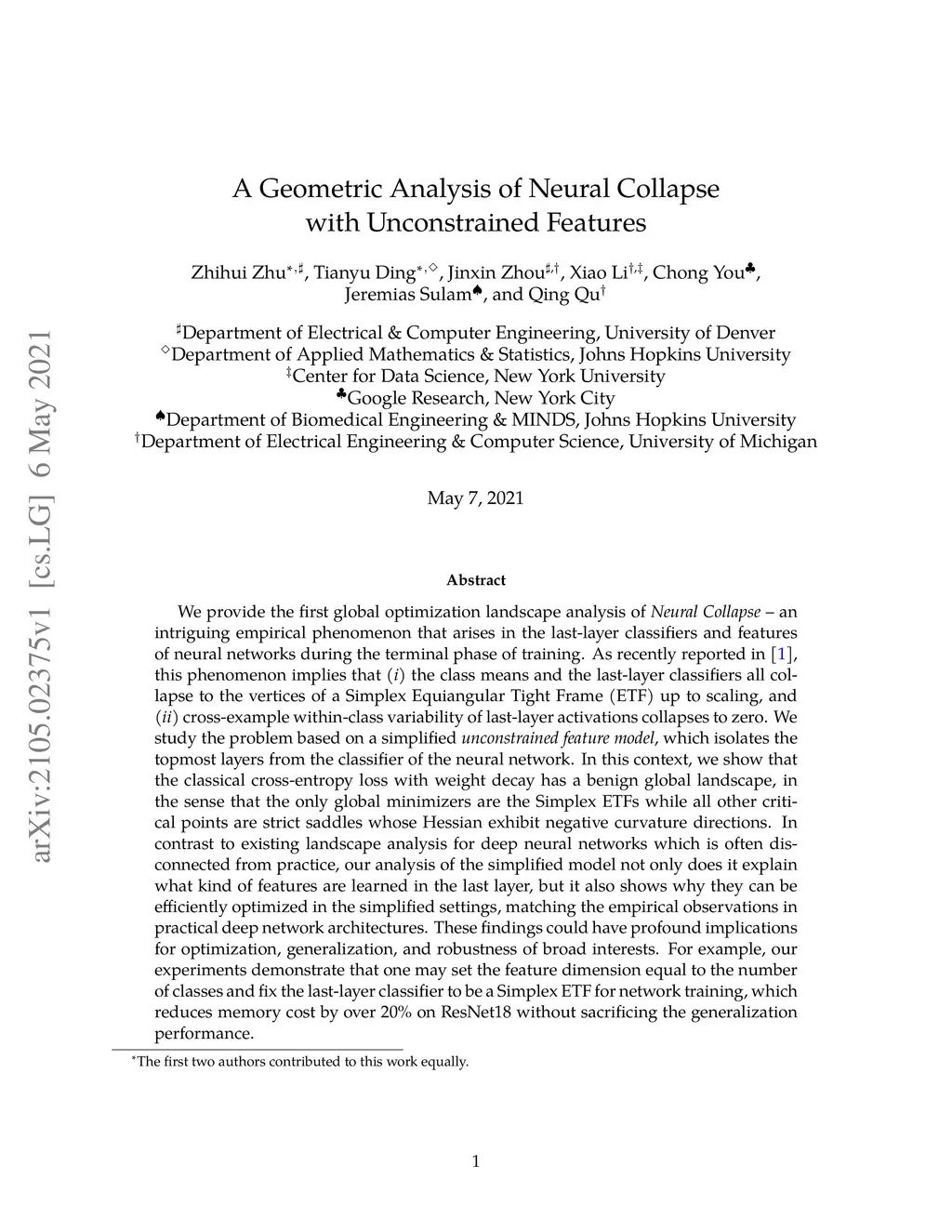 We provide the first global optimization landscape analysis of -- an intriguing empirical phenomenon that arises in the last-layer classifiers and features of neural networks during the terminal phase of training. As recently reported by Papyan et al., this phenomenon implies that () the class means and the last-layer classifiers all collapse to the vertices of a Simplex Equiangular Tight Frame (ETF) up to scaling, and () cross-example within-class variability of last-layer activations collapses to zero. We study the problem based on a simplified , which isolates the topmost layers from the classifier of the neural network. In this context, we show that the classical cross-entropy loss with weight decay has a benign global landscape, in the sense that the only global minimizers are the Simplex ETFs while all other critical points are strict saddles whose Hessian exhibit negative curvature directions. In contrast to existing landscape analysis for deep neural networks which is often disconnected from practice, our analysis of the simplified model not only does it explain what kind of features are learned in the last layer, but it also shows why they can be efficiently optimized in the simplified settings, matching the empirical observations in practical deep network architectures. These findings could have profound implications for optimization, generalization, and robustness of broad interests. For example, our experiments demonstrate that one may set the feature dimension equal to the number of classes and fix the last-layer classifier to be a Simplex ETF for network training, which reduces memory cost by over on ResNet18 without sacrificing the generalization performance.