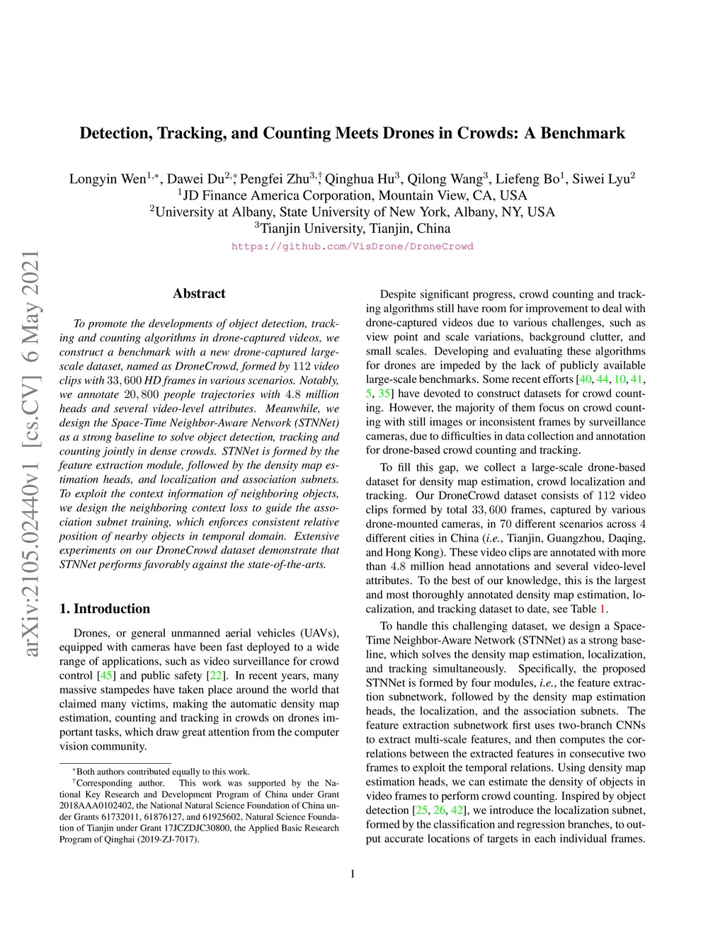 To promote the developments of object detection, tracking and counting algorithms in drone-captured videos, we construct a benchmark with a new drone-captured largescale dataset, named as DroneCrowd, formed by 112 video clips with 33,600 HD frames in various scenarios. Notably, we annotate 20,800 people trajectories with 4.8 million heads and several video-level attributes. Meanwhile, we design the Space-Time Neighbor-Aware Network (STNNet) as a strong baseline to solve object detection, tracking and counting jointly in dense crowds. STNNet is formed by the feature extraction module, followed by the density map estimation heads, and localization and association subnets. To exploit the context information of neighboring objects, we design the neighboring context loss to guide the association subnet training, which enforces consistent relative position of nearby objects in temporal domain. Extensive experiments on our DroneCrowd dataset demonstrate that STNNet performs favorably against the state-of-the-arts.