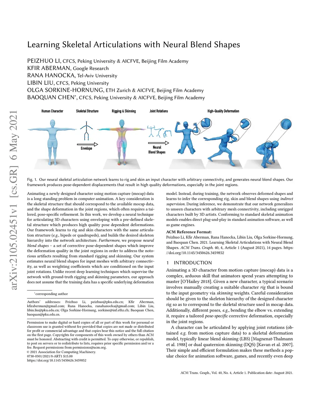 Animating a newly designed character using motion capture (mocap) data is a long standing problem in computer animation. A key consideration is the skeletal structure that should correspond to the available mocap data, and the shape deformation in the joint regions, which often requires a tailored, pose-specific refinement. In this work, we develop a neural technique for articulating 3D characters using enveloping with a pre-defined skeletal structure which produces high quality pose dependent deformations. Our framework learns to rig and skin characters with the same articulation structure (e.g., bipeds or quadrupeds), and builds the desired skeleton hierarchy into the network architecture. Furthermore, we propose neural blend shapes--a set of corrective pose-dependent shapes which improve the deformation quality in the joint regions in order to address the notorious artifacts resulting from standard rigging and skinning. Our system estimates neural blend shapes for input meshes with arbitrary connectivity, as well as weighting coefficients which are conditioned on the input joint rotations. Unlike recent deep learning techniques which supervise the network with ground-truth rigging and skinning parameters, our approach does not assume that the training data has a specific underlying deformation model. Instead, during training, the network observes deformed shapes and learns to infer the corresponding rig, skin and blend shapes using indirect supervision. During inference, we demonstrate that our network generalizes to unseen characters with arbitrary mesh connectivity, including unrigged characters built by 3D artists. Conforming to standard skeletal animation models enables direct plug-and-play in standard animation software, as well as game engines.