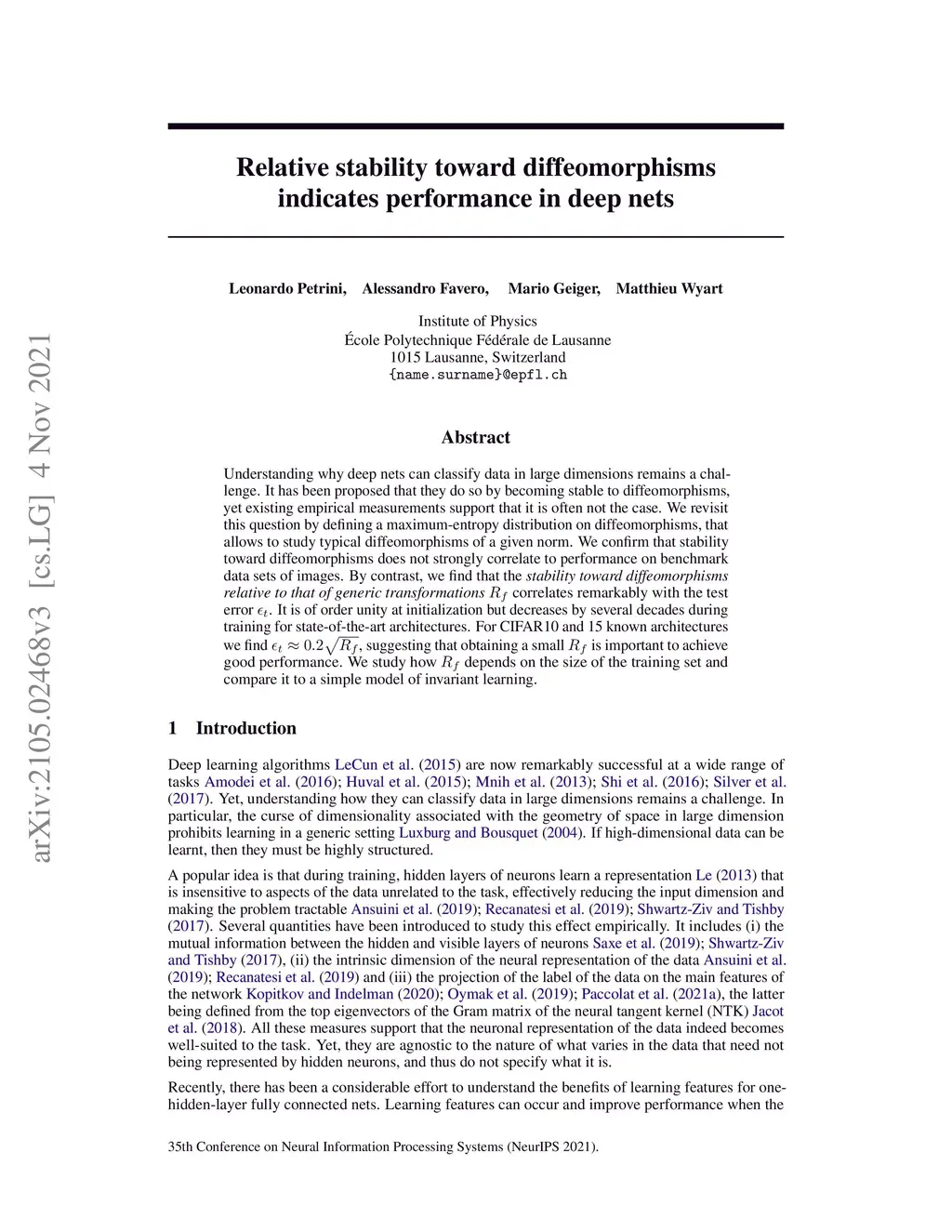Understanding why deep nets can classify data in large dimensions remains a challenge. It has been proposed that they do so by becoming stable to diffeomorphisms, yet existing empirical measurements support that it is often not the case. We revisit this question by defining a maximum-entropy distribution on diffeomorphisms, that allows to study typical diffeomorphisms of a given norm. We confirm that stability toward diffeomorphisms does not strongly correlate to performance on benchmark data sets of images. By contrast, we find that the stability toward diffeomorphisms relative to that of generic transformations correlates remarkably with the test error . It is of order unity at initialization but decreases by several decades during training for state-of-the-art architectures. For CIFAR10 and 15 known architectures, we find , suggesting that obtaining a small is important to achieve good performance. We study how depends on the size of the training set and compare it to a simple model of invariant learning.