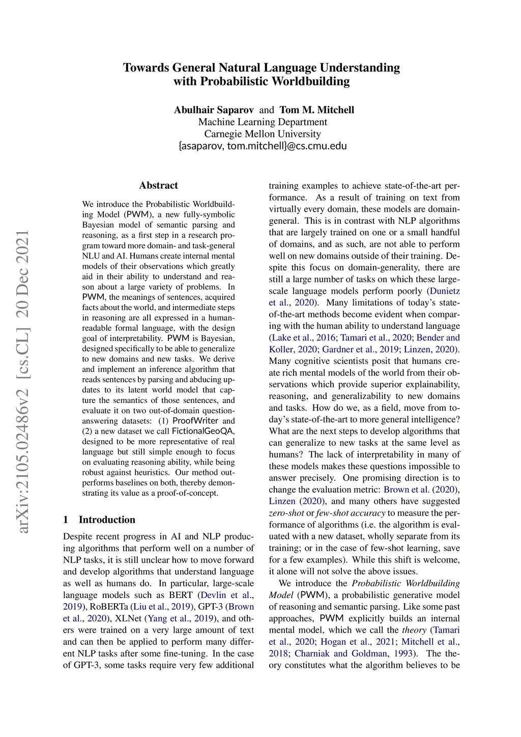 We introduce the Probabilistic Worldbuilding Model (PWM), a new fully-symbolic Bayesian model of semantic parsing and reasoning, as a first step in a research program toward more domain- and task-general NLU and AI. Humans create internal mental models of their observations which greatly aid in their ability to understand and reason about a large variety of problems. In PWM, the meanings of sentences, acquired facts about the world, and intermediate steps in reasoning are all expressed in a human-readable formal language, with the design goal of interpretability. PWM is Bayesian, designed specifically to be able to generalize to new domains and new tasks. We derive and implement an inference algorithm that reads sentences by parsing and abducing updates to its latent world model that capture the semantics of those sentences, and evaluate it on two out-of-domain question-answering datasets: (1) ProofWriter and (2) a new dataset we call FictionalGeoQA, designed to be more representative of real language but still simple enough to focus on evaluating reasoning ability, while being robust against heuristics. Our method outperforms baselines on both, thereby demonstrating its value as a proof-of-concept.