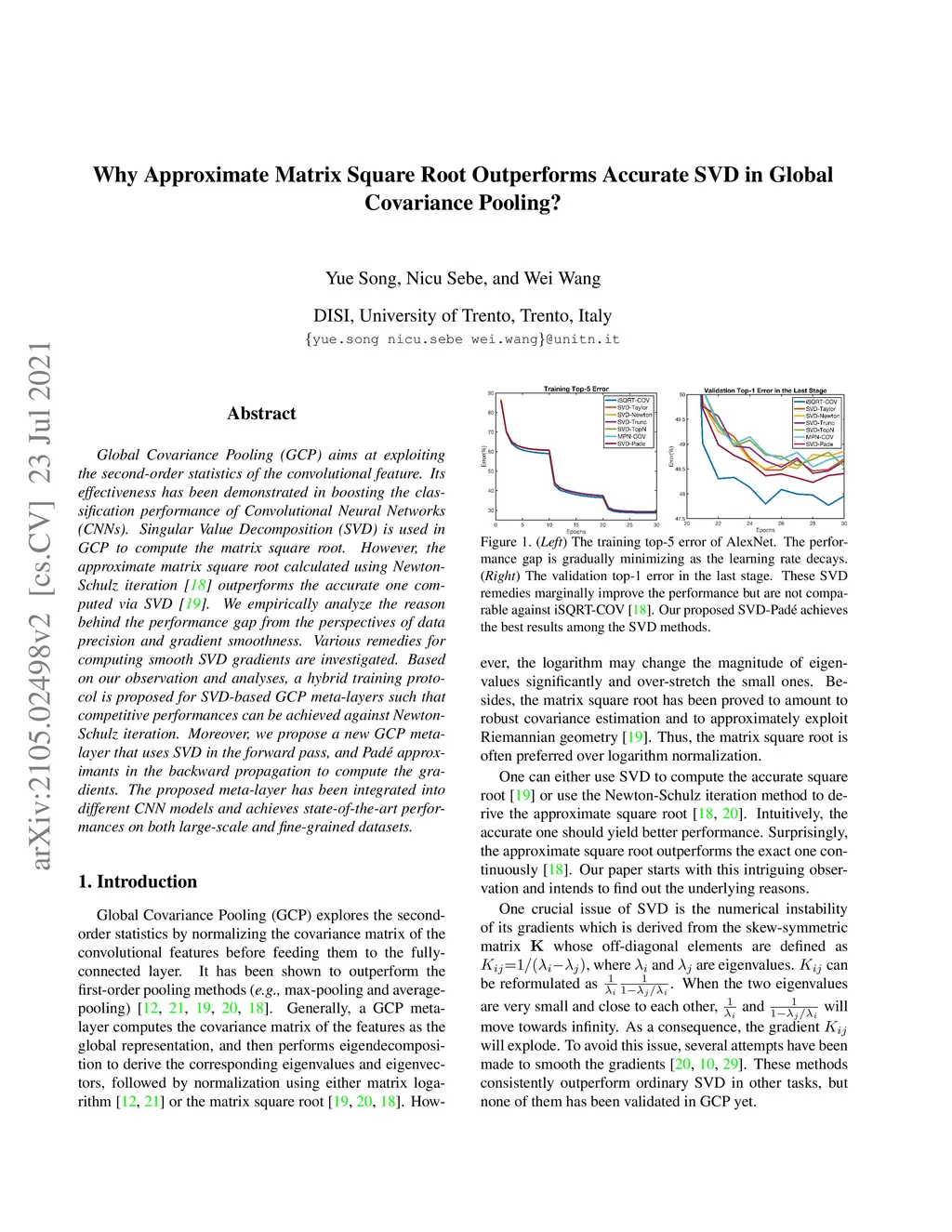Global covariance pooling (GCP) aims at exploiting the second-order statistics of the convolutional feature. Its effectiveness has been demonstrated in boosting the classification performance of Convolutional Neural Networks (CNNs). Singular Value Decomposition (SVD) is used in GCP to compute the matrix square root. However, the approximate matrix square root calculated using Newton-Schulz iteration \cite{li2018towards} outperforms the accurate one computed via SVD \cite{li2017second}. We empirically analyze the reason behind the performance gap from the perspectives of data precision and gradient smoothness. Various remedies for computing smooth SVD gradients are investigated. Based on our observation and analyses, a hybrid training protocol is proposed for SVD-based GCP meta-layers such that competitive performances can be achieved against Newton-Schulz iteration. Moreover, we propose a new GCP meta-layer that uses SVD in the forward pass, and Pad\é Approximants in the backward propagation to compute the gradients. The proposed meta-layer has been integrated into different CNN models and achieves state-of-the-art performances on both large-scale and fine-grained datasets.