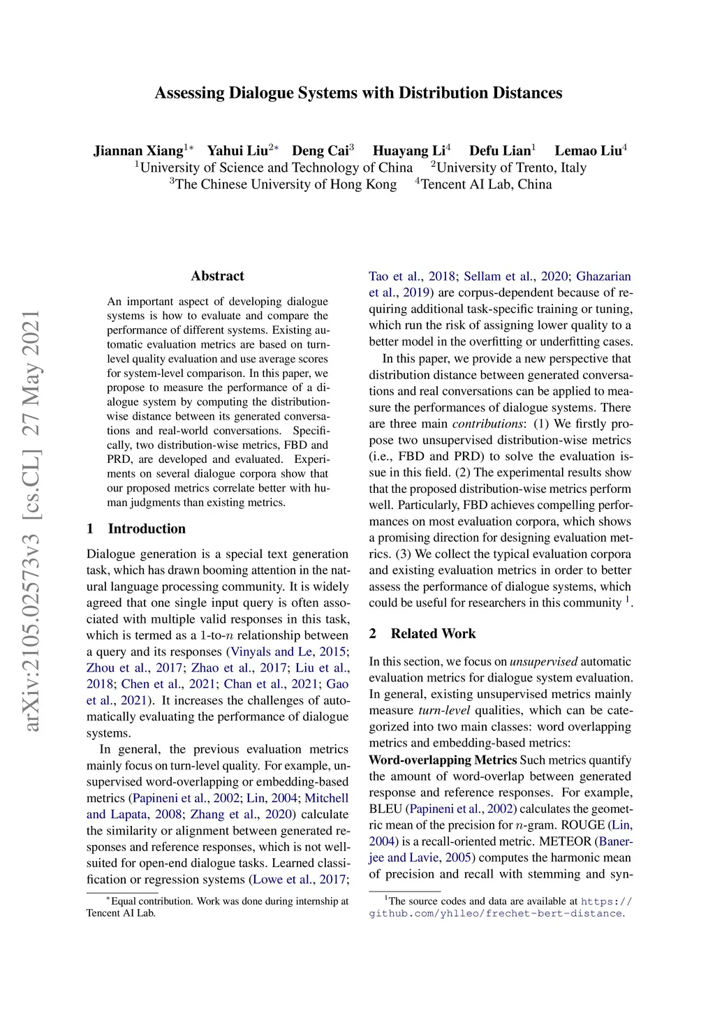 Assessing Dialogue Systems with Distribution Distances