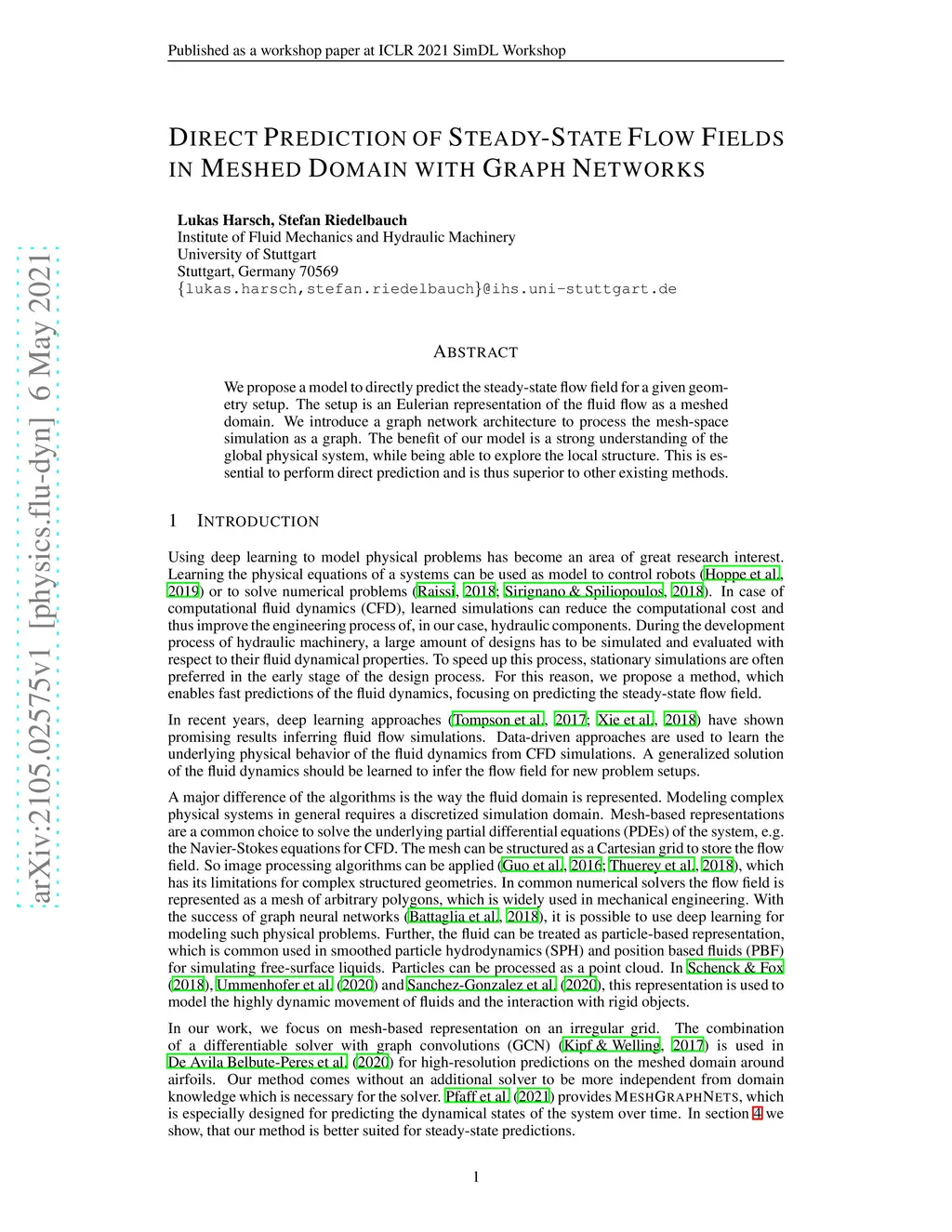 We propose a model to directly predict the steady-state flow field for a given geometry setup. The setup is an Eulerian representation of the fluid flow as a meshed domain. We introduce a graph network architecture to process the mesh-space simulation as a graph. The benefit of our model is a strong understanding of the global physical system, while being able to explore the local structure. This is essential to perform direct prediction and is thus superior to other existing methods.