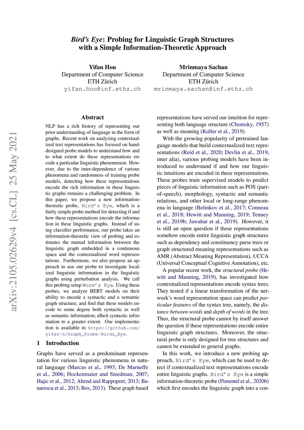 NLP has a rich history of representing our prior understanding of language in the form of graphs. Recent work on analyzing contextualized text representations has focused on hand-designed probe models to understand how and to what extent do these representations encode a particular linguistic phenomenon. However, due to the inter-dependence of various phenomena and randomness of training probe models, detecting how these representations encode the rich information in these linguistic graphs remains a challenging problem. In this paper, we propose a new information-theoretic probe, Bird's Eye, which is a fairly simple probe method for detecting if and how these representations encode the information in these linguistic graphs. Instead of using classifier performance, our probe takes an information-theoretic view of probing and estimates the mutual information between the linguistic graph embedded in a continuous space and the contextualized word representations. Furthermore, we also propose an approach to use our probe to investigate localized linguistic information in the linguistic graphs using perturbation analysis. We call this probing setup Worm's Eye. Using these probes, we analyze BERT models on their ability to encode a syntactic and a semantic graph structure, and find that these models encode to some degree both syntactic as well as semantic information; albeit syntactic information to a greater extent.