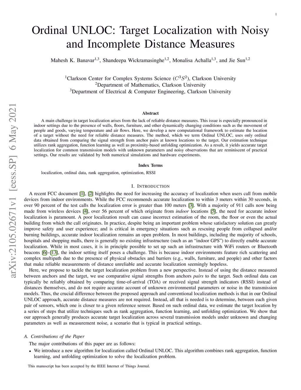 A main challenge in target localization arises from the lack of reliable distance measures. This issue is especially pronounced in indoor settings due to the presence of walls, floors, furniture, and other dynamically changing conditions such as the movement of people and goods, varying temperature, and airflows. Here, we develop a new computational framework to estimate the location of a target without the need for reliable distance measures. The method, which we term Ordinal UNLOC, uses only ordinal data obtained from comparing the signal strength from anchor pairs at known locations to the target. Our estimation technique utilizes rank aggregation, function learning as well as proximity-based unfolding optimization. As a result, it yields accurate target localization for common transmission models with unknown parameters and noisy observations that are reminiscent of practical settings. Our results are validated by both numerical simulations and hardware experiments.