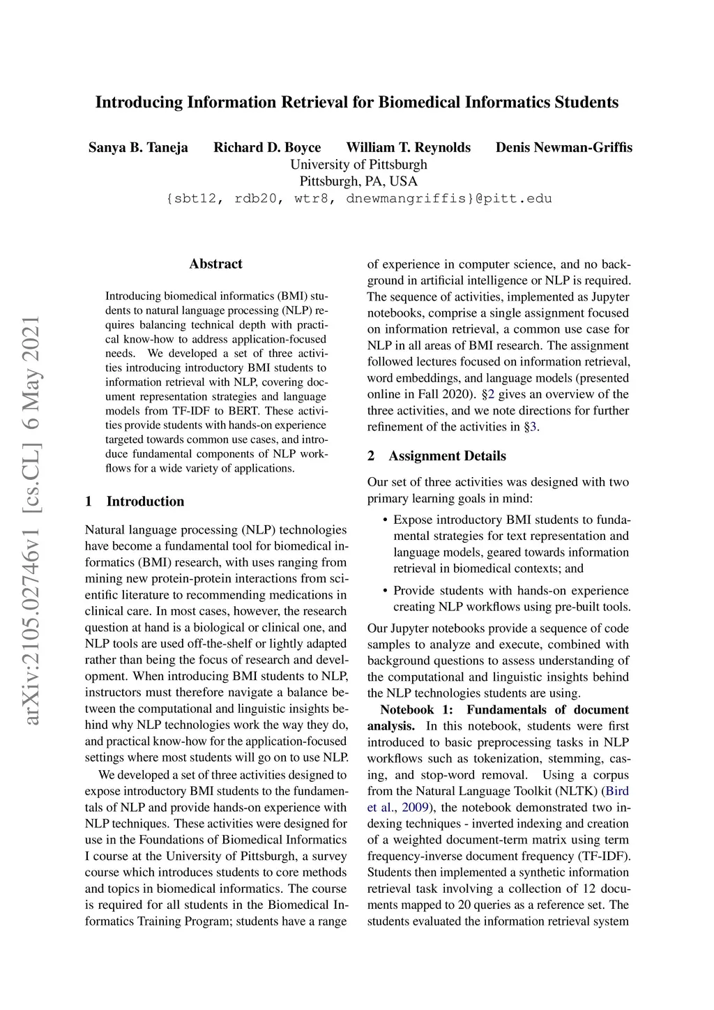 Introducing biomedical informatics (BMI) students to natural language processing (NLP) requires balancing technical depth with practical know-how to address application-focused needs. We developed a set of three activities introducing introductory BMI students to information retrieval with NLP, covering document representation strategies and language models from TF-IDF to BERT. These activities provide students with hands-on experience targeted towards common use cases, and introduce fundamental components of NLP workflows for a wide variety of applications.