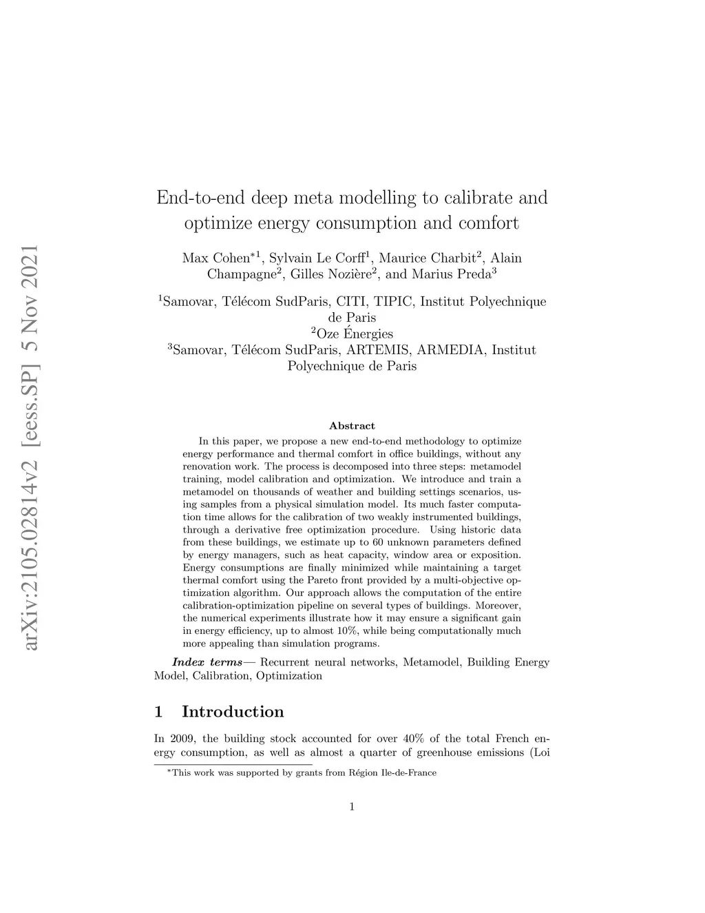 In this paper, we propose a new end-to-end methodology to optimize the energy performance as well as comfort and air quality in large buildings without any renovation work. We introduce a metamodel based on recurrent neural networks and trained to predict the behavior of a general class of buildings using a database sampled from a simulation program. This metamodel is then deployed in different frameworks and its parameters are calibrated using the specific data of two real buildings. Parameters are estimated by comparing the predictions of the metamodel with real data obtained from sensors using the CMA-ES algorithm, a derivative free optimization procedure. Then, energy consumptions are optimized while maintaining a target thermal comfort and air quality, using the NSGA-II multi-objective optimization procedure. The numerical experiments illustrate how this metamodel ensures a significant gain in energy efficiency, up to almost 10%, while being computationally much more appealing than numerical models and flexible enough to be adapted to several types of buildings.
