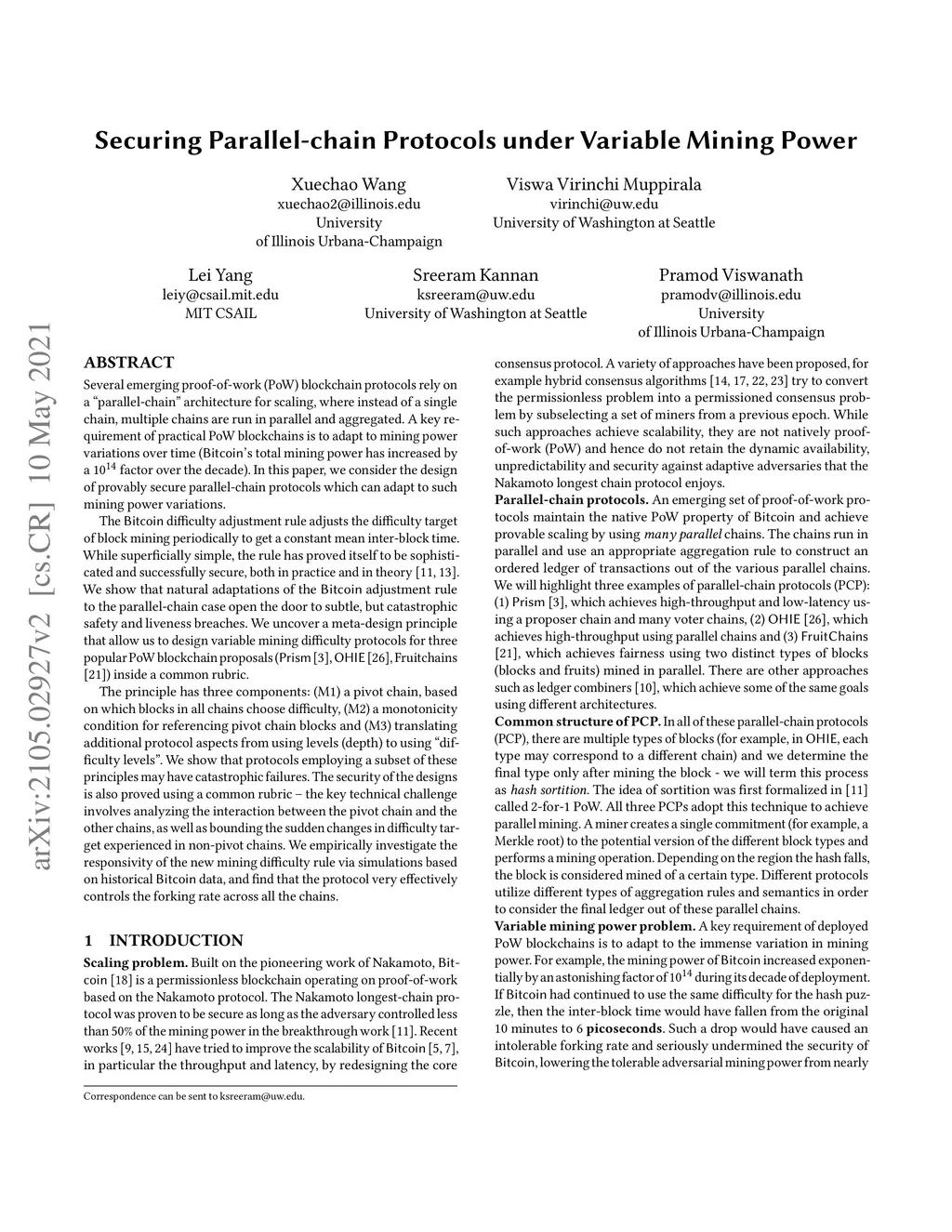 Several emerging PoW blockchain protocols rely on a "parallel-chain" architecture for scaling, where instead of a single chain, multiple chains are run in parallel and aggregated. A key requirement of practical PoW blockchains is to adapt to mining power variations over time. In this paper, we consider the design of provably secure parallel-chain protocols which can adapt to such mining power variations. The Bitcoin difficulty adjustment rule adjusts the difficulty target of block mining periodically to get a constant mean inter-block time. While superficially simple, the rule has proved itself to be sophisticated and successfully secure, both in practice and in theory. We show that natural adaptations of the Bitcoin adjustment rule to the parallel-chain case open the door to subtle, but catastrophic safety and liveness breaches. We uncover a meta-design principle that allow us to design variable mining difficulty protocols for three popular PoW blockchain proposals (Prism, OHIE, and Fruitchains) inside a common rubric. The principle has three components:(M1) a pivot chain, based on which blocks in all chains choose difficulty, (M2) a monotonicity condition for referencing pivot chain blocks and (M3) translating additional protocol aspects from using levels (depth) to using "difficulty levels". We show that protocols employing a subset of these principles may have catastrophic failures. The security of the designs is also proved using a common rubric - the key technical challenge involves analyzing the interaction between the pivot chain and the other chains, as well as bounding the sudden changes in difficulty target experienced in non-pivot chains. We empirically investigate the responsivity of the new mining difficulty rule via simulations based on historical Bitcoin data, and find that the protocol very effectively controls the forking rate across all the chains.