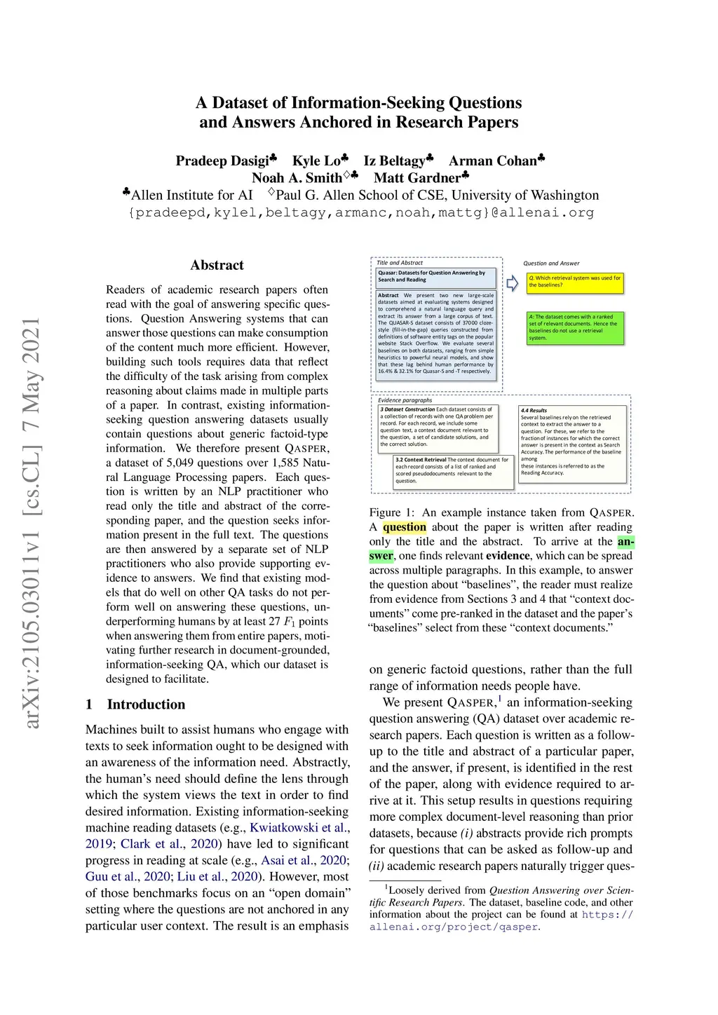 Readers of academic research papers often read with the goal of answering specific questions. Question Answering systems that can answer those questions can make consumption of the content much more efficient. However, building such tools requires data that reflect the difficulty of the task arising from complex reasoning about claims made in multiple parts of a paper. In contrast, existing information-seeking question answering datasets usually contain questions about generic factoid-type information. We therefore present QASPER, a dataset of 5,049 questions over 1,585 Natural Language Processing papers. Each question is written by an NLP practitioner who read only the title and abstract of the corresponding paper, and the question seeks information present in the full text. The questions are then answered by a separate set of NLP practitioners who also provide supporting evidence to answers. We find that existing models that do well on other QA tasks do not perform well on answering these questions, underperforming humans by at least 27 F1 points when answering them from entire papers, motivating further research in document-grounded, information-seeking QA, which our dataset is designed to facilitate.