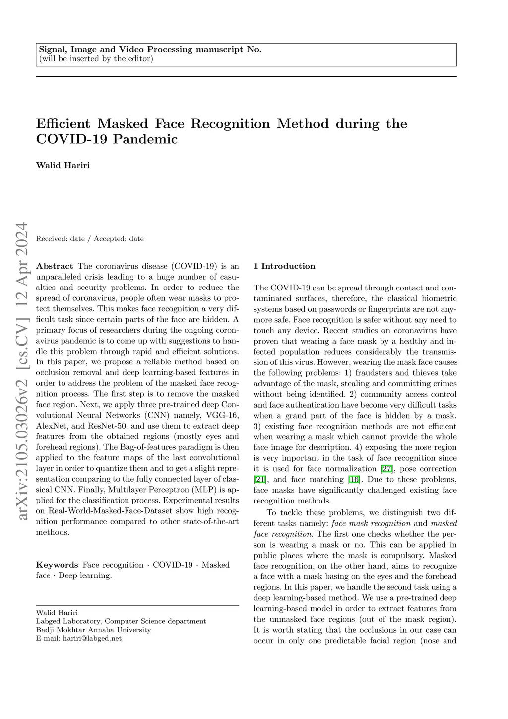 The coronavirus disease (COVID-19) is an unparalleled crisis leading to a huge number of casualties and security problems. In order to reduce the spread of coronavirus, people often wear masks to protect themselves. This makes face recognition a very difficult task since certain parts of the face are hidden. A primary focus of researchers during the ongoing coronavirus pandemic is to come up with suggestions to handle this problem through rapid and efficient solutions. In this paper, we propose a reliable method based on occlusion removal and deep learning-based features in order to address the problem of the masked face recognition process. The first step is to remove the masked face region. Next, we apply three pre-trained deep Convolutional Neural Networks (CNN) namely, VGG-16, AlexNet, and ResNet-50, and use them to extract deep features from the obtained regions (mostly eyes and forehead regions). The Bag-of-features paradigm is then applied to the feature maps of the last convolutional layer in order to quantize them and to get a slight representation comparing to the fully connected layer of classical CNN. Finally, Multilayer Perceptron (MLP) is applied for the classification process. Experimental results on Real-World-Masked-Face-Dataset show high recognition performance compared to other state-of-the-art methods.