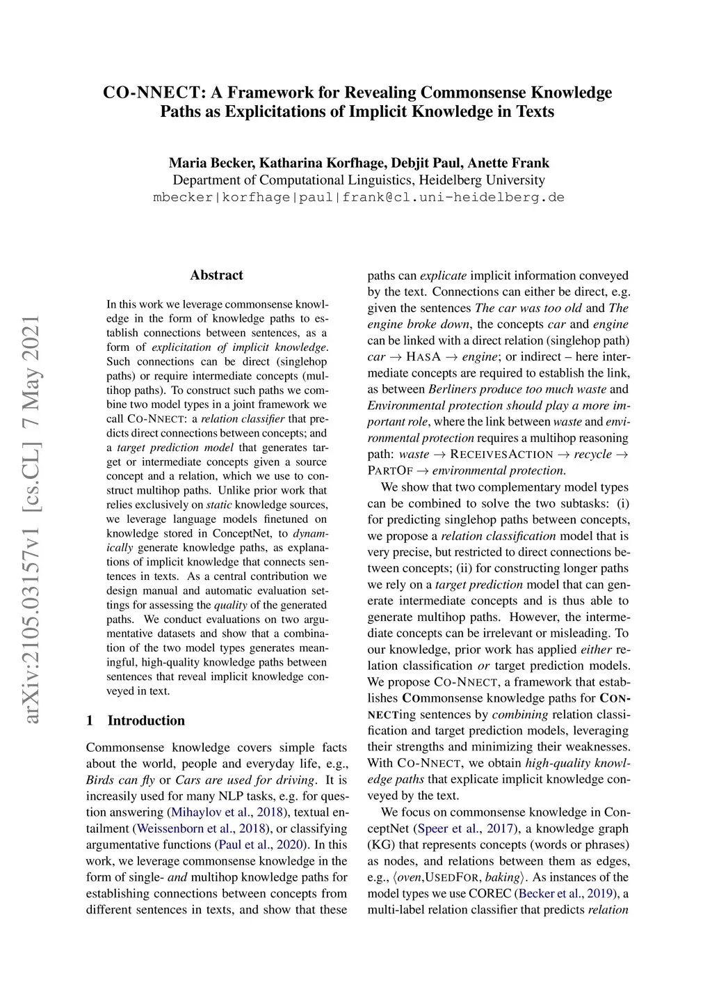 In this work we leverage commonsense knowledge in form of knowledge paths to establish connections between sentences, as a form of explicitation of implicit knowledge. Such connections can be direct (singlehop paths) or require intermediate concepts (multihop paths). To construct such paths we combine two model types in a joint framework we call Co-nnect: a relation classifier that predicts direct connections between concepts; and a target prediction model that generates target or intermediate concepts given a source concept and a relation, which we use to construct multihop paths. Unlike prior work that relies exclusively on static knowledge sources, we leverage language models finetuned on knowledge stored in ConceptNet, to dynamically generate knowledge paths, as explanations of implicit knowledge that connects sentences in texts. As a central contribution we design manual and automatic evaluation settings for assessing the quality of the generated paths. We conduct evaluations on two argumentative datasets and show that a combination of the two model types generates meaningful, high-quality knowledge paths between sentences that reveal implicit knowledge conveyed in text.