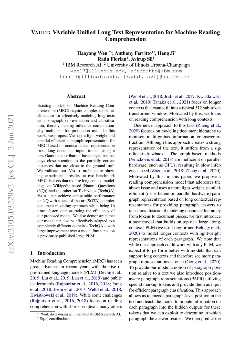 Existing models on Machine Reading Comprehension (MRC) require complex model architecture for effectively modeling long texts with paragraph representation and classification, thereby making inference computationally inefficient for production use. In this work, we propose VAULT: a light-weight and parallel-efficient paragraph representation for MRC based on contextualized representation from long document input, trained using a new Gaussian distribution-based objective that pays close attention to the partially correct instances that are close to the ground-truth. We validate our VAULT architecture showing experimental results on two benchmark MRC datasets that require long context modeling; one Wikipedia-based (Natural Questions (NQ)) and the other on TechNotes (TechQA). VAULT can achieve comparable performance on NQ with a state-of-the-art (SOTA) complex document modeling approach while being 16 times faster, demonstrating the efficiency of our proposed model. We also demonstrate that our model can also be effectively adapted to a completely different domain -- TechQA -- with large improvement over a model fine-tuned on a previously published large PLM.