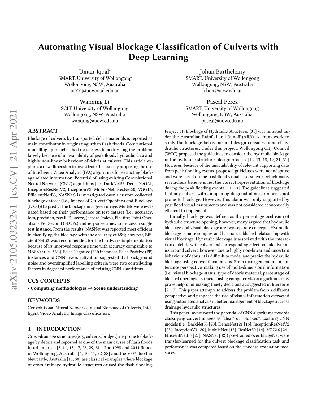 Blockage of culverts by transported debris materials is reported as main contributor in originating urban flash floods. Conventional modelling approaches had no success in addressing the problem largely because of unavailability of peak floods hydraulic data and highly non-linear behaviour of debris at culvert. This article explores a new dimension to investigate the issue by proposing the use of Intelligent Video Analytic (IVA) algorithms for extracting blockage related information. Potential of using existing Convolutional Neural Network (CNN) algorithms (i.e., DarkNet53, DenseNet121, InceptionResNetV2, InceptionV3, MobileNet, ResNet50, VGG16, EfficientNetB3, NASNet) is investigated over a custom collected blockage dataset (i.e., Images of Culvert Openings and Blockage (ICOB)) to predict the blockage in a given image. Models were evaluated based on their performance on test dataset (i.e., accuracy, loss, precision, recall, F1-score, Jaccard-Index), Floating Point Operations Per Second (FLOPs) and response times to process a single test instance. From the results, NASNet was reported most efficient in classifying the blockage with the accuracy of 85\%; however, EfficientNetB3 was recommended for the hardware implementation because of its improved response time with accuracy comparable to NASNet (i.e., 83\%). False Negative (FN) instances, False Positive (FP) instances and CNN layers activation suggested that background noise and oversimplified labelling criteria were two contributing factors in degraded performance of existing CNN algorithms.
