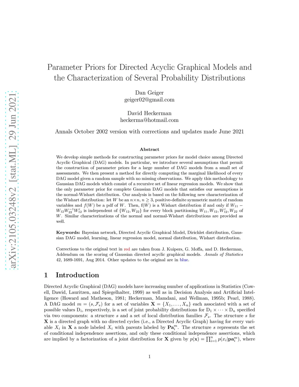 We develop simple methods for constructing parameter priors for model choice among Directed Acyclic Graphical (DAG) models. In particular, we introduce several assumptions that permit the construction of parameter priors for a large number of DAG models from a small set of assessments. We then present a method for directly computing the marginal likelihood of every DAG model given a random sample with no missing observations. We apply this methodology to Gaussian DAG models which consist of a recursive set of linear regression models. We show that the only parameter prior for complete Gaussian DAG models that satisfies our assumptions is the normal-Wishart distribution. Our analysis is based on the following new characterization of the Wishart distribution: let be an , , positive-definite symmetric matrix of random variables and be a pdf of . Then, f is a Wishart distribution if and only if is independent of for every block partitioning of . Similar characterizations of the normal and normal-Wishart distributions are provided as well.