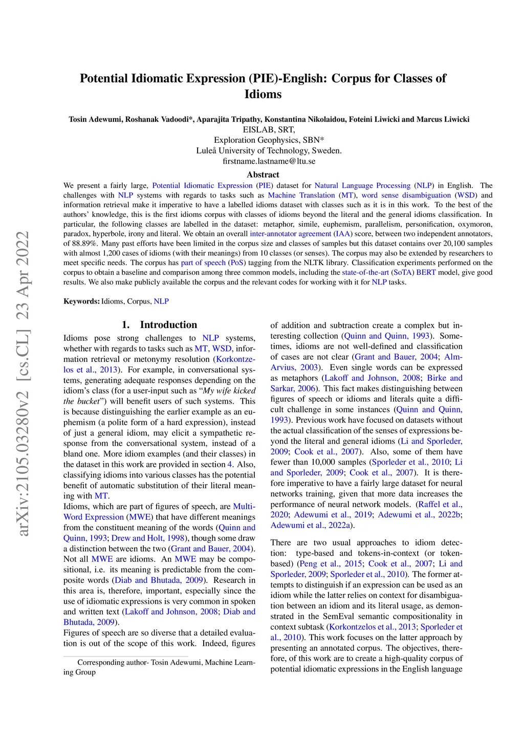 We present a fairly large, Potential Idiomatic Expression (PIE) dataset for Natural Language Processing (NLP) in English. The challenges with NLP systems with regards to tasks such as Machine Translation (MT), word sense disambiguation (WSD) and information retrieval make it imperative to have a labelled idioms dataset with classes such as it is in this work. To the best of the authors' knowledge, this is the first idioms corpus with classes of idioms beyond the literal and the general idioms classification. In particular, the following classes are labelled in the dataset: metaphor, simile, euphemism, parallelism, personification, oxymoron, paradox, hyperbole, irony and literal. We obtain an overall inter-annotator agreement (IAA) score, between two independent annotators, of 88.89%. Many past efforts have been limited in the corpus size and classes of samples but this dataset contains over 20,100 samples with almost 1,200 cases of idioms (with their meanings) from 10 classes (or senses). The corpus may also be extended by researchers to meet specific needs. The corpus has part of speech (PoS) tagging from the NLTK library. Classification experiments performed on the corpus to obtain a baseline and comparison among three common models, including the BERT model, give good results. We also make publicly available the corpus and the relevant codes for working with it for NLP tasks.