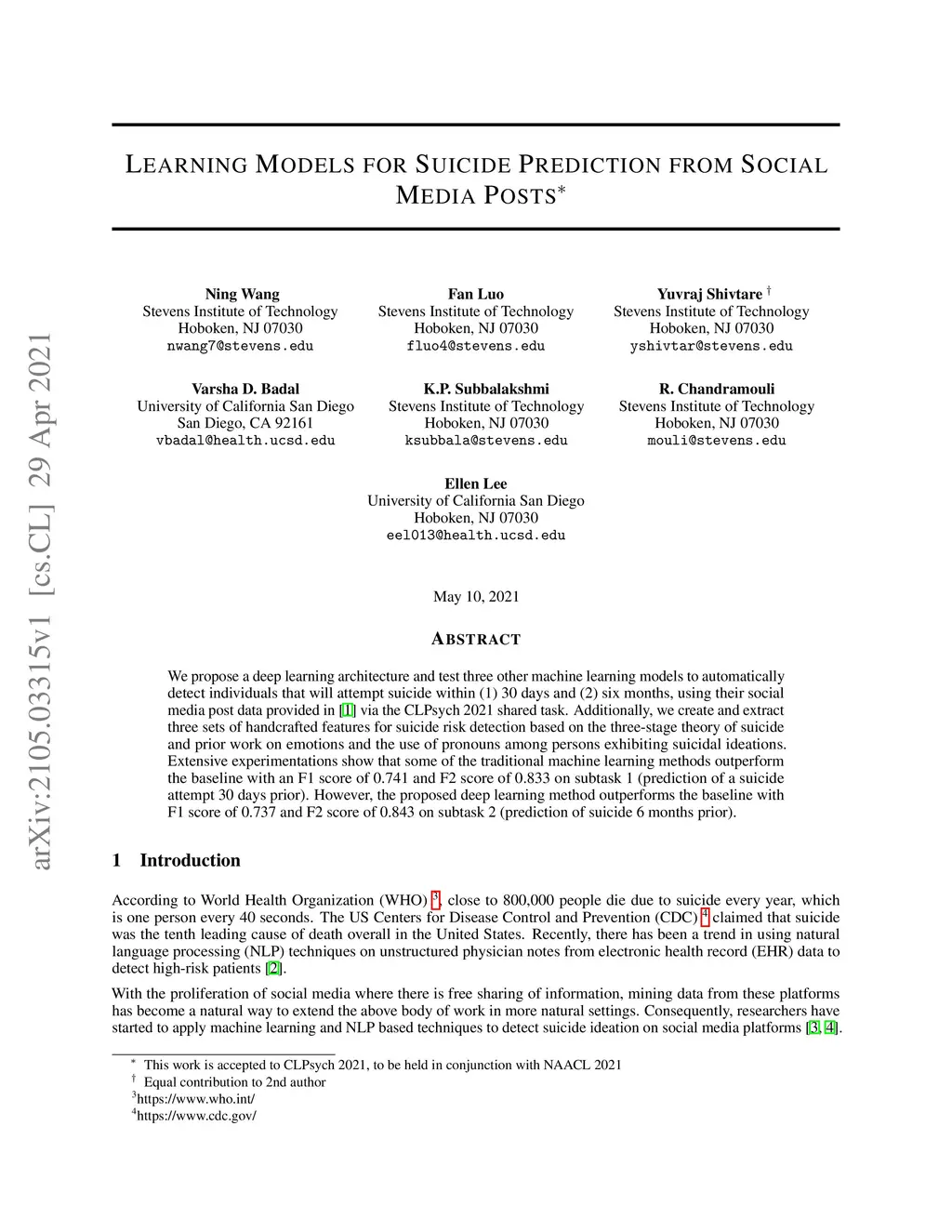 We propose a deep learning architecture and test three other machine learning models to automatically detect individuals that will attempt suicide within (1) 30 days and (2) six months, using their social media post data provided in the CLPsych 2021 shared task. Additionally, we create and extract three sets of handcrafted features for suicide risk detection based on the three-stage theory of suicide and prior work on emotions and the use of pronouns among persons exhibiting suicidal ideations. Extensive experimentations show that some of the traditional machine learning methods outperform the baseline with an F1 score of 0.741 and F2 score of 0.833 on subtask 1 (prediction of a suicide attempt 30 days prior). However, the proposed deep learning method outperforms the baseline with F1 score of 0.737 and F2 score of 0.843 on subtask 2 (prediction of suicide 6 months prior).