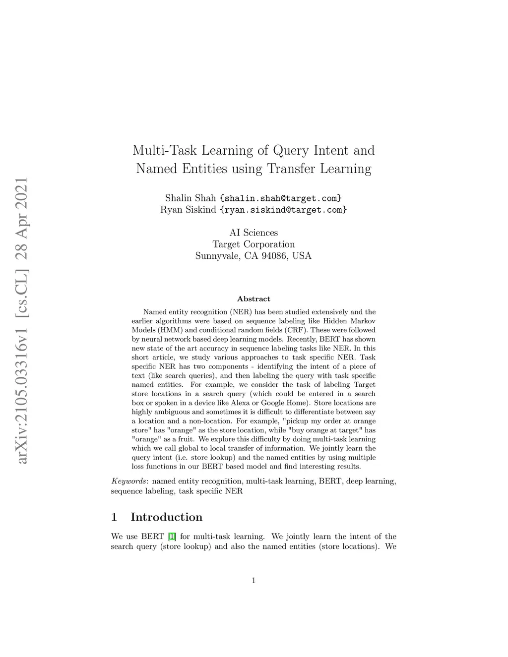 Named entity recognition (NER) has been studied extensively and the earlier algorithms were based on sequence labeling like Hidden Markov Models (HMM) and conditional random fields (CRF). These were followed by neural network based deep learning models. Recently, BERT has shown new state of the art accuracy in sequence labeling tasks like NER. In this short article, we study various approaches to task specific NER. Task specific NER has two components - identifying the intent of a piece of text (like search queries), and then labeling the query with task specific named entities. For example, we consider the task of labeling Target store locations in a search query (which could be entered in a search box or spoken in a device like Alexa or Google Home). Store locations are highly ambiguous and sometimes it is difficult to differentiate between say a location and a non-location. For example, "pickup my order at orange store" has "orange" as the store location, while "buy orange at target" has "orange" as a fruit. We explore this difficulty by doing multi-task learning which we call global to local transfer of information. We jointly learn the query intent (i.e. store lookup) and the named entities by using multiple loss functions in our BERT based model and find interesting results.
