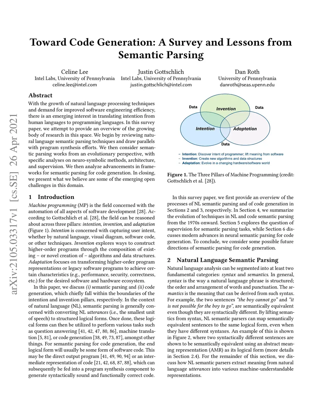 With the growth of natural language processing techniques and demand for improved software engineering efficiency, there is an emerging interest in translating intention from human languages to programming languages. In this survey paper, we attempt to provide an overview of the growing body of research in this space. We begin by reviewing natural language semantic parsing techniques and draw parallels with program synthesis efforts. We then consider semantic parsing works from an evolutionary perspective, with specific analyses on neuro-symbolic methods, architecture, and supervision. We then analyze advancements in frameworks for semantic parsing for code generation. In closing, we present what we believe are some of the emerging open challenges in this domain.