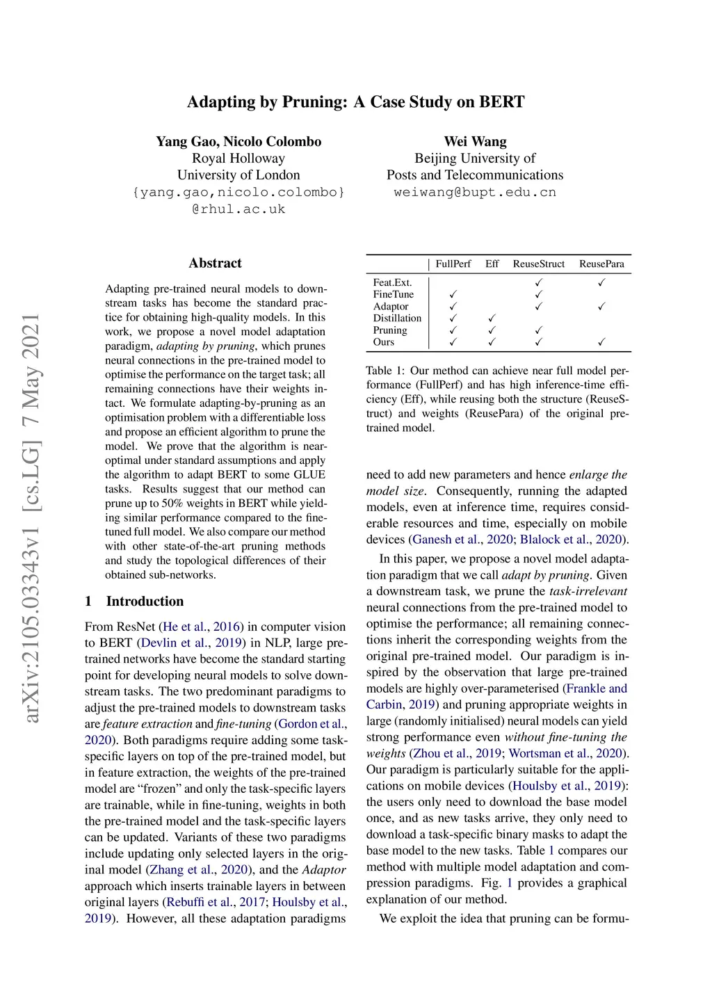 Adapting pre-trained neural models to downstream tasks has become the standard practice for obtaining high-quality models. In this work, we propose a novel model adaptation paradigm, adapting by pruning, which prunes neural connections in the pre-trained model to optimise the performance on the target task; all remaining connections have their weights intact. We formulate adapting-by-pruning as an optimisation problem with a differentiable loss and propose an efficient algorithm to prune the model. We prove that the algorithm is near-optimal under standard assumptions and apply the algorithm to adapt BERT to some GLUE tasks. Results suggest that our method can prune up to 50% weights in BERT while yielding similar performance compared to the fine-tuned full model. We also compare our method with other state-of-the-art pruning methods and study the topological differences of their obtained sub-networks.