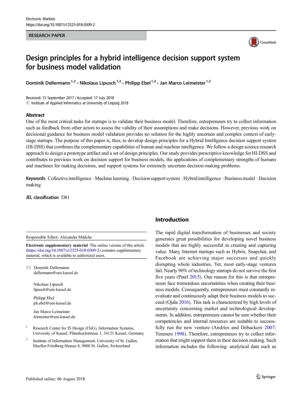 One of the most critical tasks for startups is to validate their business model. Therefore, entrepreneurs try to collect information such as feedback from other actors to assess the validity of their assumptions and make decisions. However, previous work on decisional guidance for business model validation provides no solution for the highly uncertain and complex context of earlystage startups. The purpose of this paper is, thus, to develop design principles for a Hybrid Intelligence decision support system (HI-DSS) that combines the complementary capabilities of human and machine intelligence. We follow a design science research approach to design a prototype artifact and a set of design principles. Our study provides prescriptive knowledge for HI-DSS and contributes to previous work on decision support for business models, the applications of complementary strengths of humans and machines for making decisions, and support systems for extremely uncertain decision-making problems.