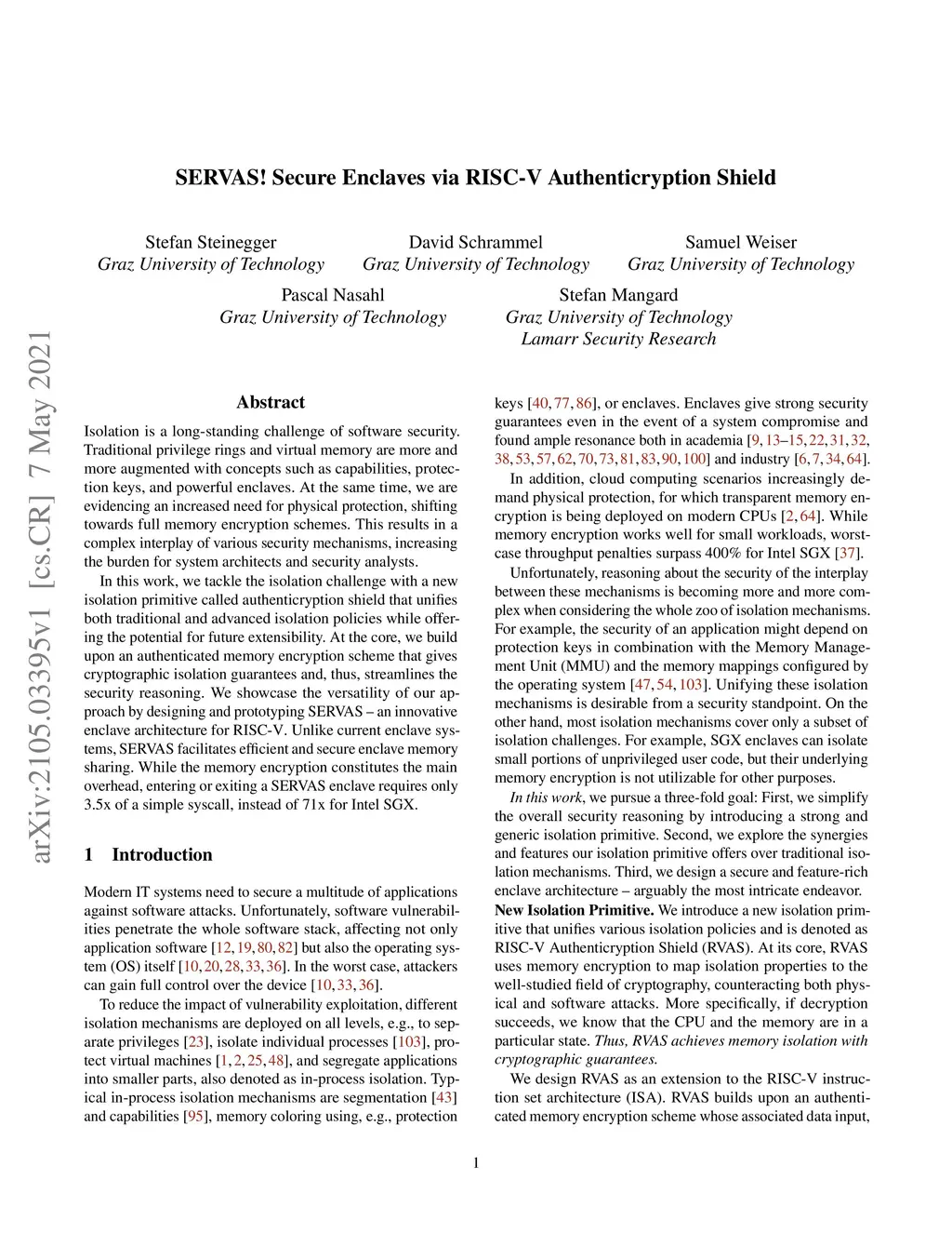 SERVAS! Secure Enclaves via RISC-V Authenticryption Shield