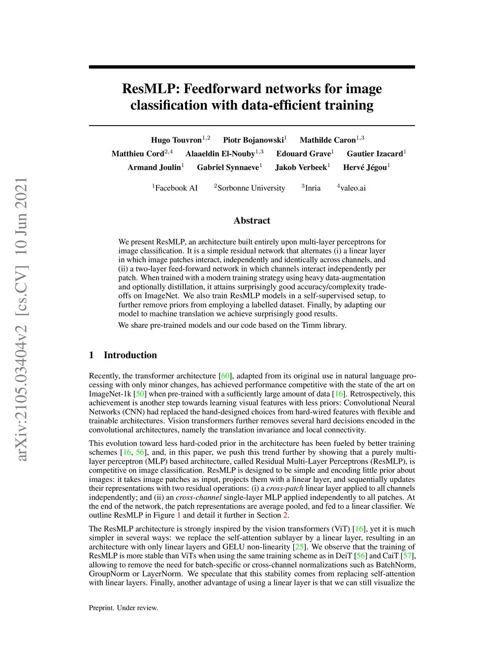 We present ResMLP, an architecture built entirely upon multi-layer perceptrons for image classification. It is a simple residual network that alternates (i) a linear layer in which image patches interact, independently and identically across channels, and (ii) a two-layer feed-forward network in which channels interact independently per patch. When trained with a modern training strategy using heavy data-augmentation and optionally distillation, it attains surprisingly good accuracy/complexity trade-offs on ImageNet. We also train ResMLP models in a self-supervised setup, to further remove priors from employing a labelled dataset. Finally, by adapting our model to machine translation we achieve surprisingly good results. We share pre-trained models and our code based on the Timm library.