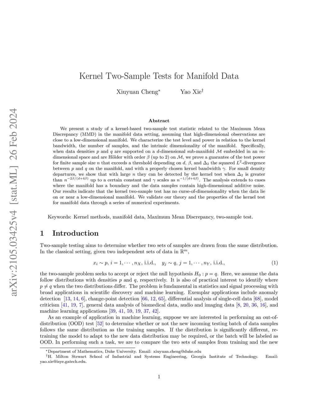 We present a study of kernel based two-sample test statistic, which is related to the Maximum Mean Discrepancy (MMD), in the manifold data setting, assuming that high-dimensional observations are close to a low-dimensional manifold. We characterize the test level and power in relation to the kernel bandwidth, the number of samples, and the intrinsic dimensionality of the manifold. Specifically, we show that when data densities are supported on a -dimensional sub-manifold embedded in an -dimensional space, the kernel two-sample test for data sampled from a pair of distributions that are H\"older with order is consistent and powerful when the number of samples is greater than up to certain constant, where is the squared -divergence between two distributions on manifold. Moreover, to achieve testing consistency under this scaling of , our theory suggests that the kernel bandwidth scales with . These results indicate that the kernel two-sample test does not have a curse-of-dimensionality when the data lie on a low-dimensional manifold. We demonstrate the validity of our theory and the property of the kernel test for manifold data using several numerical experiments.