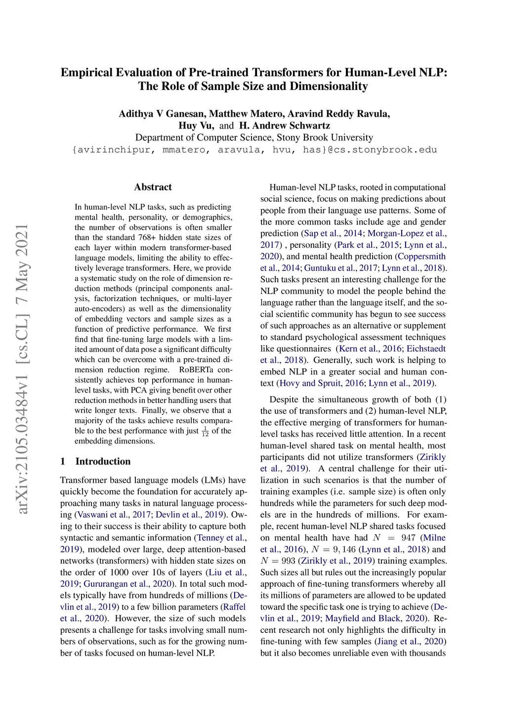 In human-level NLP tasks, such as predicting mental health, personality, or demographics, the number of observations is often smaller than the standard 768+ hidden state sizes of each layer within modern transformer-based language models, limiting the ability to effectively leverage transformers. Here, we provide a systematic study on the role of dimension reduction methods (principal components analysis, factorization techniques, or multi-layer auto-encoders) as well as the dimensionality of embedding vectors and sample sizes as a function of predictive performance. We first find that fine-tuning large models with a limited amount of data pose a significant difficulty which can be overcome with a pre-trained dimension reduction regime. RoBERTa consistently achieves top performance in human-level tasks, with PCA giving benefit over other reduction methods in better handling users that write longer texts. Finally, we observe that a majority of the tasks achieve results comparable to the best performance with just of the embedding dimensions.