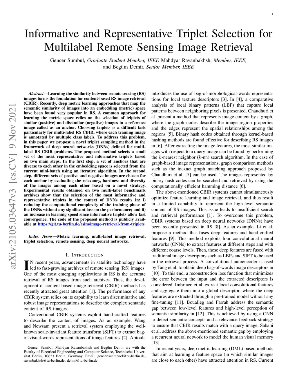 Learning the similarity between remote sensing (RS) images forms the foundation for content-based RS image retrieval (CBIR). Recently, deep metric learning approaches that map the semantic similarity of images into an embedding (metric) space have been found very popular in RS. A common approach for learning the metric space relies on the selection of triplets of similar (positive) and dissimilar (negative) images to a reference image called as an anchor. Choosing triplets is a difficult task particularly for multi-label RS CBIR, where each training image is annotated by multiple class labels. To address this problem, in this paper we propose a novel triplet sampling method in the framework of deep neural networks (DNNs) defined for multi-label RS CBIR problems. The proposed method selects a small set of the most representative and informative triplets based on two main steps. In the first step, a set of anchors that are diverse to each other in the embedding space is selected from the current mini-batch using an iterative algorithm. In the second step, different sets of positive and negative images are chosen for each anchor by evaluating the relevancy, hardness and diversity of the images among each other based on a novel strategy. Experimental results obtained on two multi-label benchmark archives show that the selection of the most informative and representative triplets in the context of DNNs results in: i) reducing the computational complexity of the training phase of the DNNs without any significant loss on the performance; and ii) an increase in learning speed since informative triplets allow fast convergence. The code of the proposed method is publicly available at https://git.tu-berlin.de/rsim/image-retrieval-from-triplets.