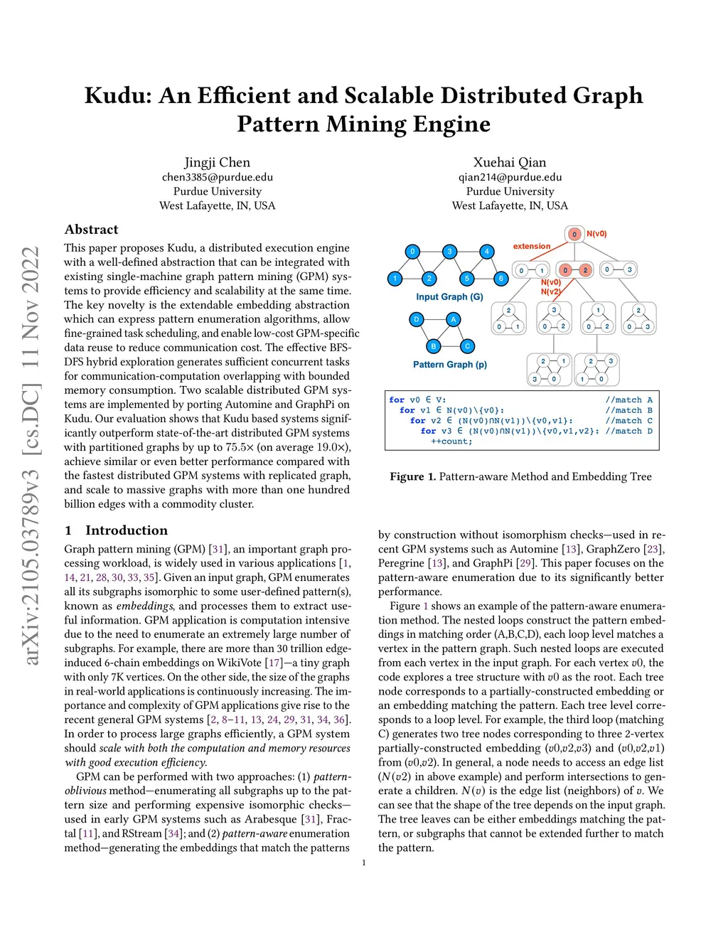 This paper proposes Khuzdul, a distributed execution engine with a well-defined abstraction that can be integrated with existing single-machine graph pattern mining (GPM) systems to provide efficiency and scalability at the same time. The key novelty is the extendable embedding abstraction which can express pattern enumeration algorithms, allow fine-grained task scheduling, and enable low-cost GPMspecific data reuse to reduce communication cost. The effective BFS-DFS hybrid exploration generates sufficient concurrent tasks for communication-computation overlapping with bounded memory consumption. Two scalable distributed GPM systems are implemented by porting Automine and GraphPi on Khuzdul. Our evaluation shows that Khuzdul based systems significantly outperform state-of-the-art distributed GPM systems with partitioned graphs by up to 75.5x (on average 19.0x), achieve similar or even better performance compared with the fastest distributed GPM systems with replicated graph, and scale to massive graphs with more than one hundred billion edges with a commodity cluster.