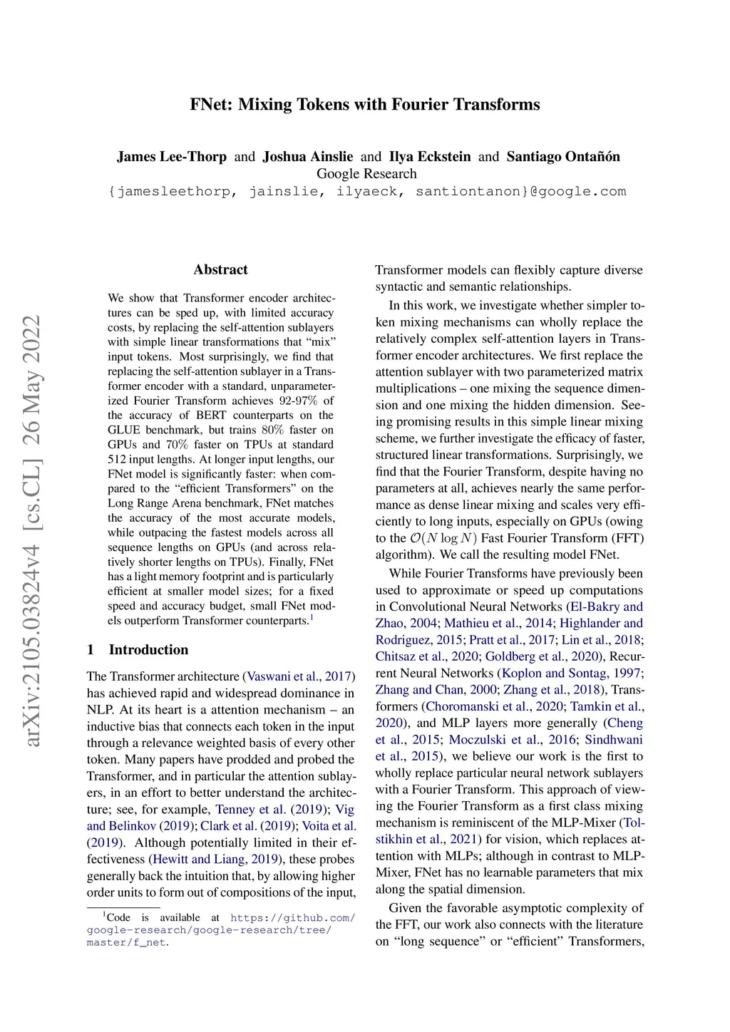 We show that Transformer encoder architectures can be sped up, with limited accuracy costs, by replacing the self-attention sublayers with simple linear transformations that "mix" input tokens. These linear mixers, along with standard nonlinearities in feed-forward layers, prove competent at modeling semantic relationships in several text classification tasks. Most surprisingly, we find that replacing the self-attention sublayer in a Transformer encoder with a standard, unparameterized Fourier Transform achieves 92-97% of the accuracy of BERT counterparts on the GLUE benchmark, but trains 80% faster on GPUs and 70% faster on TPUs at standard 512 input lengths. At longer input lengths, our FNet model is significantly faster: when compared to the "efficient" Transformers on the Long Range Arena benchmark, FNet matches the accuracy of the most accurate models, while outpacing the fastest models across all sequence lengths on GPUs (and across relatively shorter lengths on TPUs). Finally, FNet has a light memory footprint and is particularly efficient at smaller model sizes; for a fixed speed and accuracy budget, small FNet models outperform Transformer counterparts.