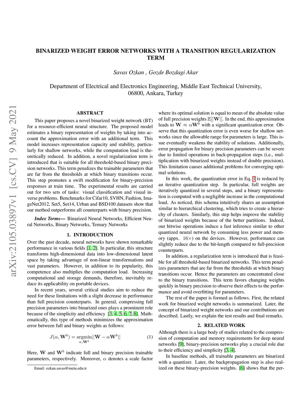 This paper proposes a novel binarized weight network (BT) for a resource-efficient neural structure. The proposed model estimates a binary representation of weights by taking into account the approximation error with an additional term. This model increases representation capacity and stability, particularly for shallow networks, while the computation load is theoretically reduced. In addition, a novel regularization term is introduced that is suitable for all threshold-based binary precision networks. This term penalizes the trainable parameters that are far from the thresholds at which binary transitions occur. This step promotes a swift modification for binary-precision responses at train time. The experimental results are carried out for two sets of tasks: visual classification and visual inverse problems. Benchmarks for Cifar10, SVHN, Fashion, ImageNet2012, Set5, Set14, Urban and BSD100 datasets show that our method outperforms all counterparts with binary precision.