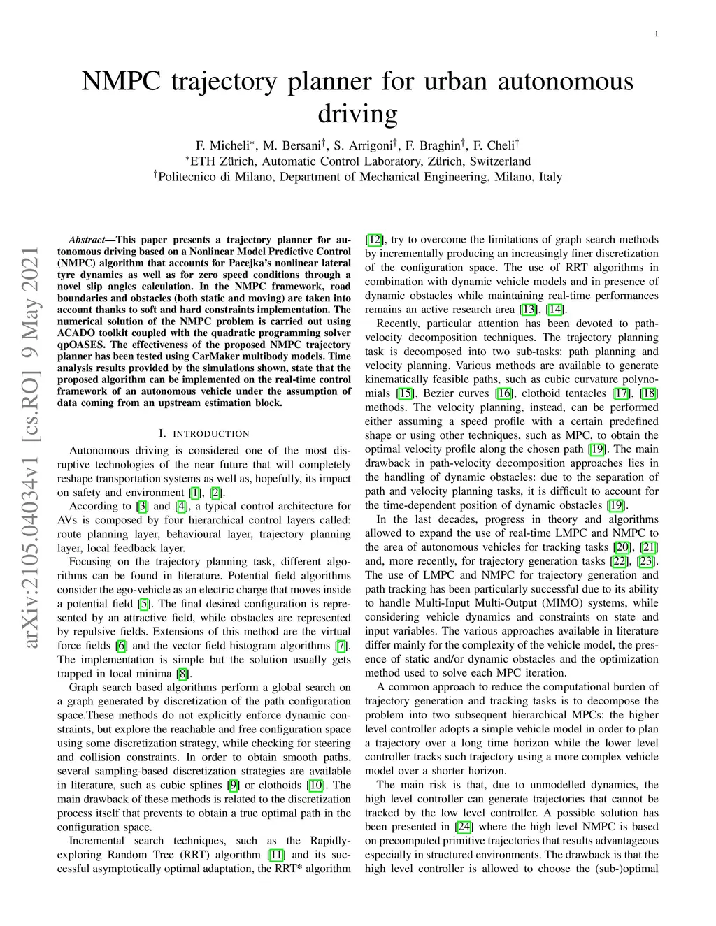 This paper presents a trajectory planner for autonomous driving based on a Nonlinear Model Predictive Control (NMPC) algorithm that accounts for Pacejka's nonlinear lateral tyre dynamics as well as for zero speed conditions through a novel slip angles calculation. In the NMPC framework, road boundaries and obstacles (both static and moving) are taken into account thanks to soft and hard constraints implementation. The numerical solution of the NMPC problem is carried out using ACADO toolkit coupled with the quadratic programming solver qpOASES. The effectiveness of the proposed NMPC trajectory planner has been tested using CarMaker multibody models. Time analysis results provided by the simulations shown, state that the proposed algorithm can be implemented on the real-time control framework of an autonomous vehicle under the assumption of data coming from an upstream estimation block.